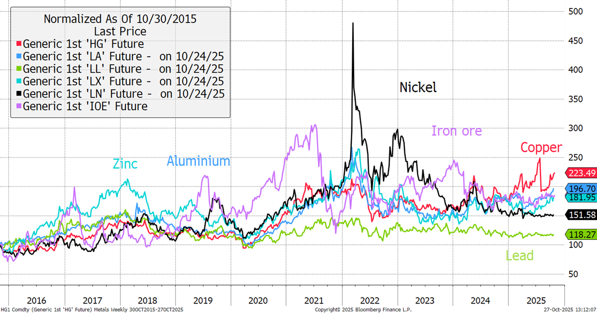 While gold and silver prices are up 3x or more over 10 years, the best of the industrial metals, copper, is up 2x, with the rest lagging behind. It seems more likely than not that industrial metals will catch up, as they have in previous cycles.