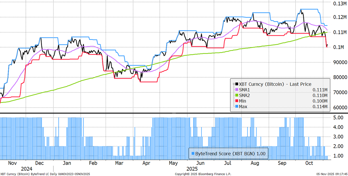 Bitcoin’s ByteTrend Score stays at 1, but the price of Bitcoin tested $100k on Tuesday. It bounced. The 200-day moving average remains upward-sloping, but the other factors incorporated in the ByteTrend indicator are now negative.