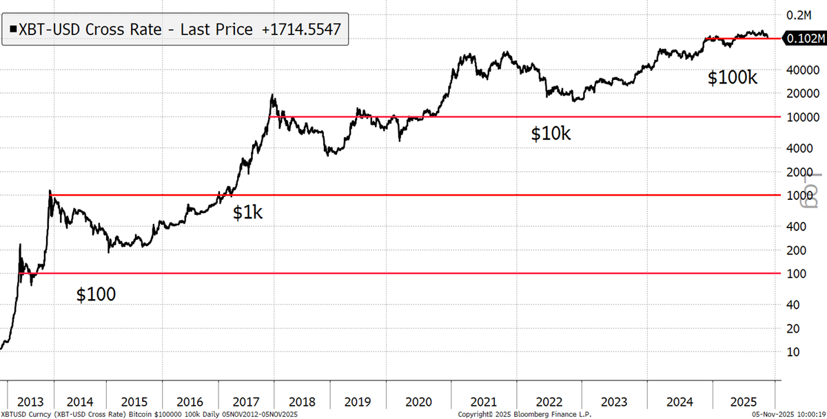 Time to roll out the major levels. $100 and $1,000 were first seen in 2013; $10,000 came in 2017; and $100,000 came in November 2024. There is no need to get too bearish on Bitcoin at this point, but a correction is underway. Perhaps $100k holds.