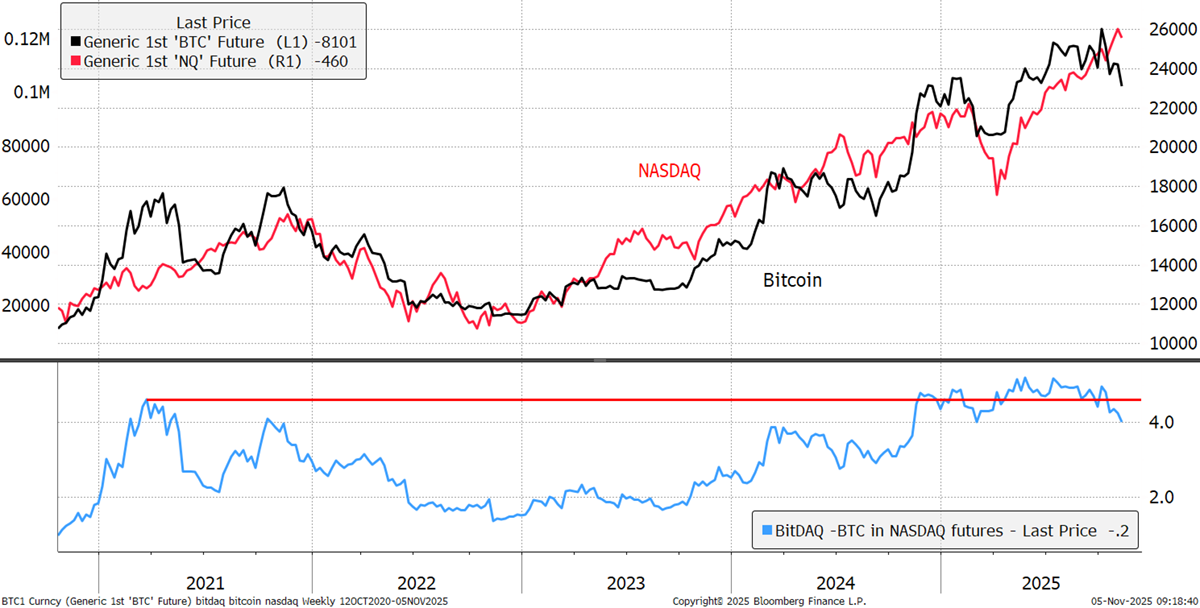 Over the years, Bitcoin has been a leading indicator of risky assets in general. It moves up and down before the technology sector. Bitcoin is likely forecasting a correction in technology stocks.