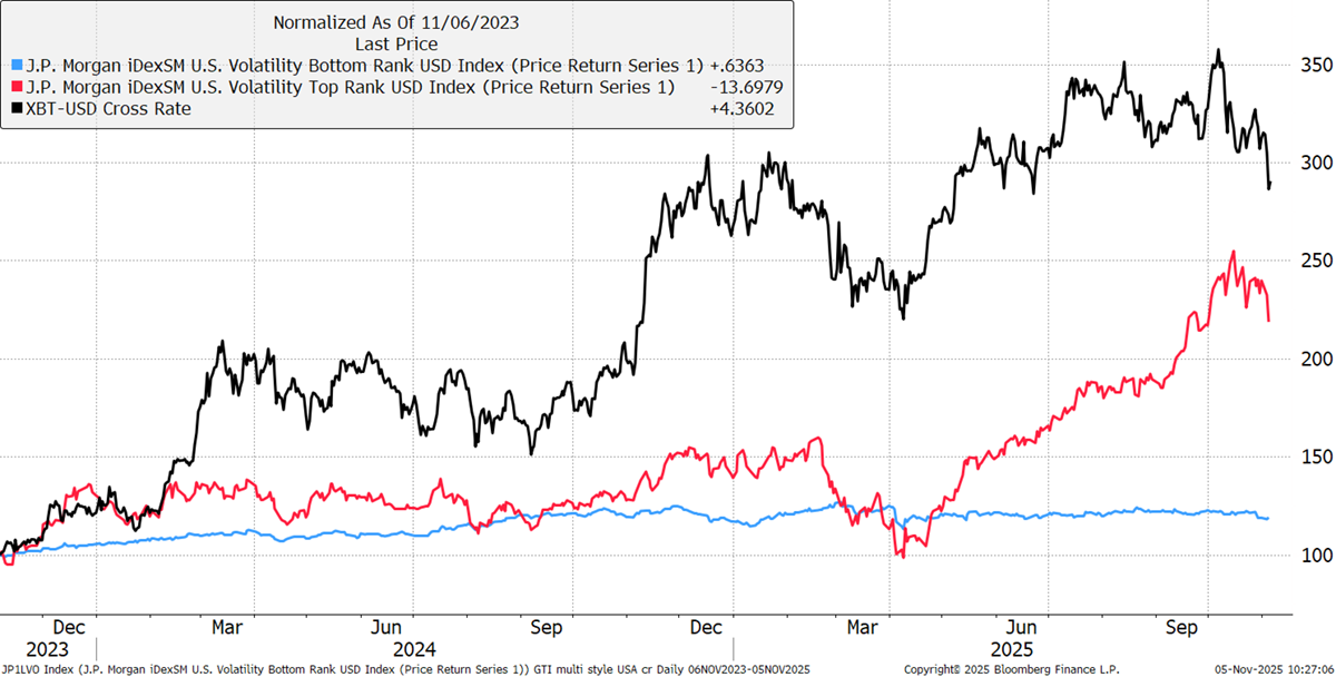Bitcoin, High Volatility Stocks, and Low Volatility Stocks
