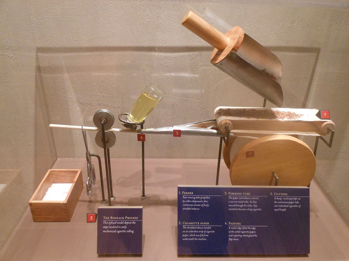 As early as 1826, some scientists concluded that tobacco was poisonous in some way, but their findings had little impact. By the 1880s, most tobacco was produced for chewing, and cigarettes were made of the leftovers. Cigars and cigarettes, being pre-rolled, became a luxury. However, when James Bonsack invented a cigarette rolling machine in 1880, everything changed. At the time, manual production was slow, with skilled workmen rolling about four cigarettes per minute, not enough to meet the rising demand of the 1870s.