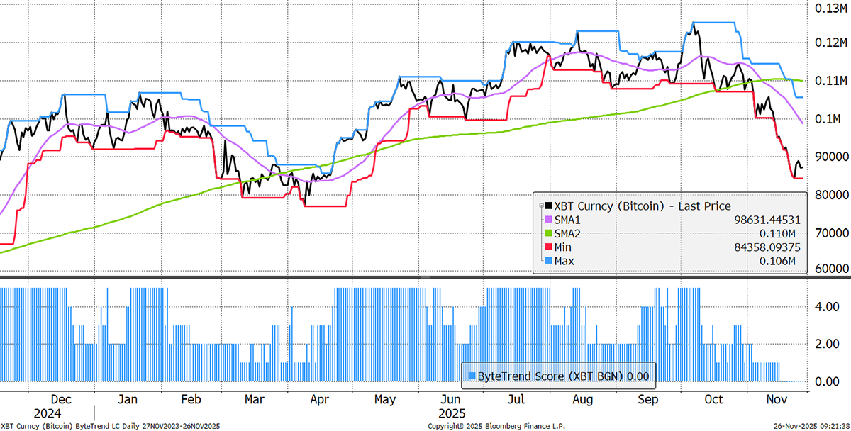 Bitcoin’s ByteTrend Score remains at a score of 0 since 16 November. This is bearish.