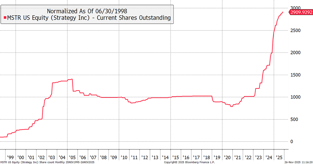 For that to work, the MSTR share price must trade at a premium to the value of its Bitcoin holdings, so that they can issue highly priced shares to buy more BTC. The company started doing this in 2020 and has since tripled its outstanding B shares, which have funded BTC purchases.