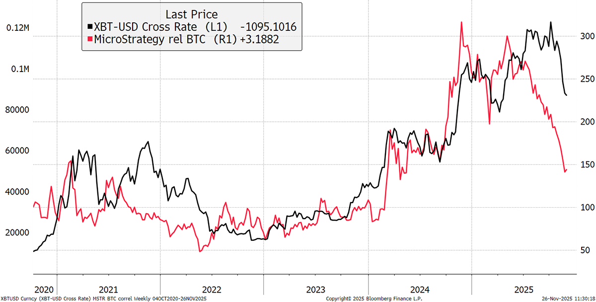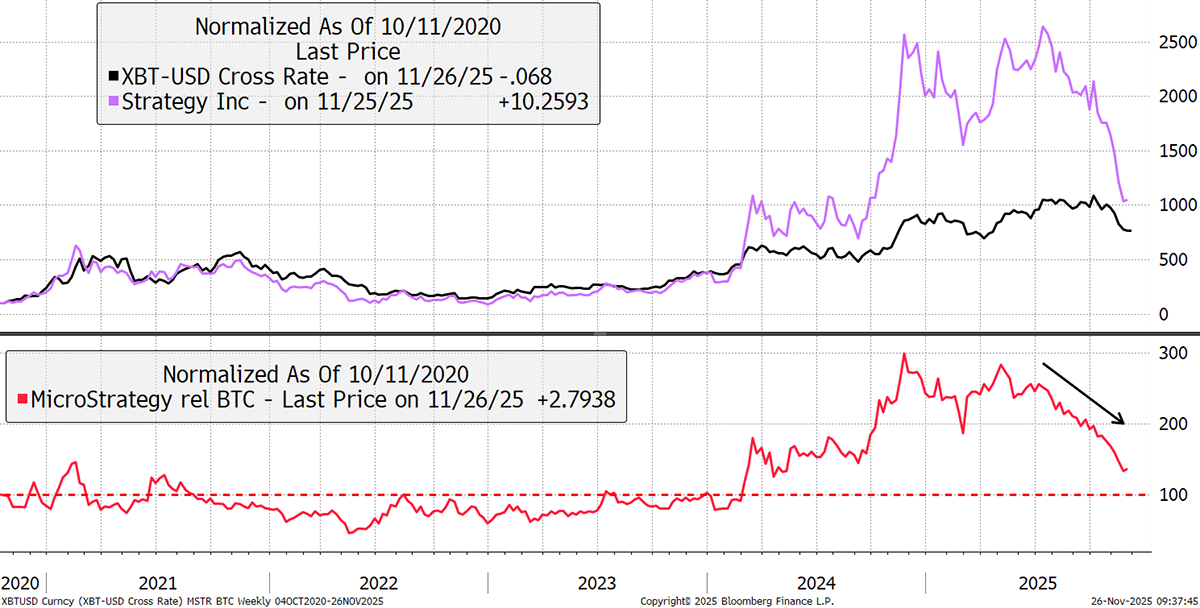 The MSTR issue relates to Bitcoin itself. While accumulating 649,870 BTC was all good fun for the market, the threat of the coins being sold has not only impacted MSTR shares, but BTC as well. The chart overlaying MSTR in BTC with Bitcoin shows high correlation and high beta. The evaporation of the MSTR premium is very likely a negative force for Bitcoin.