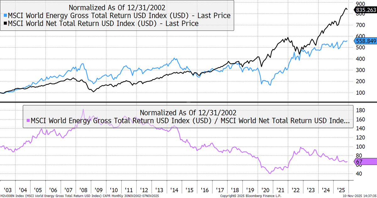 This is another case of a sector that beat the market comfortably up to 2008 and has since given back its gains. The low point came during the pandemic, when US oil futures briefly traded in negative territory. I suspect things will improve from here, especially given the tighter controls on Russian exports.
