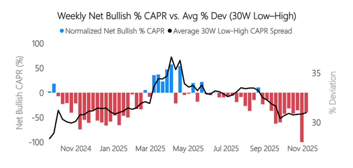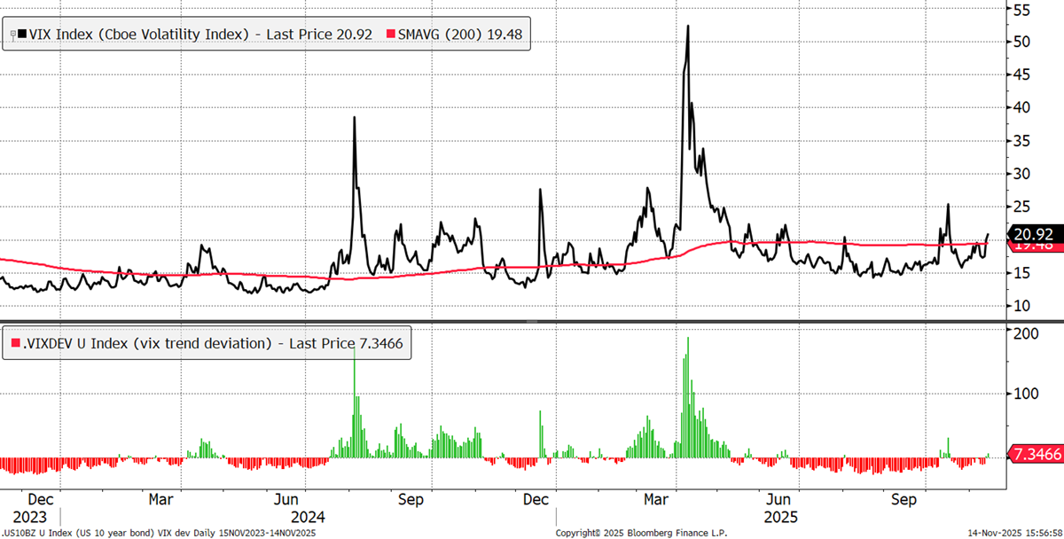 Market risk has picked up. Since the last market high in October, energy and healthcare have proved to be the most resilient sectors, with defensive sectors lagging behind. Yet over the past fortnight, there has been a notable selloff in the tech sector. The VIX is back above its 200-day moving average.