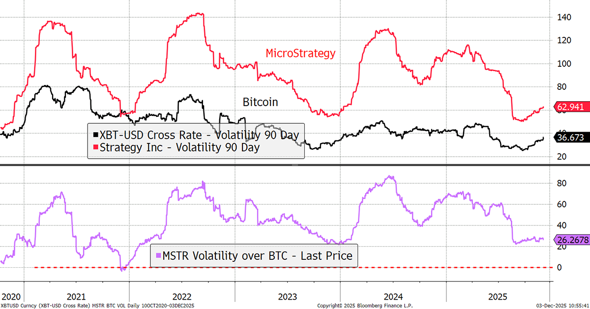 The other development is volatility. MSTR’s high volatility was used to sell convertible bonds with low coupons, as the “option value” was high. Saylor used the high volatility as an asset. That has now fallen and is slowly converging with Bitcoin itself, meaning that the game is up.