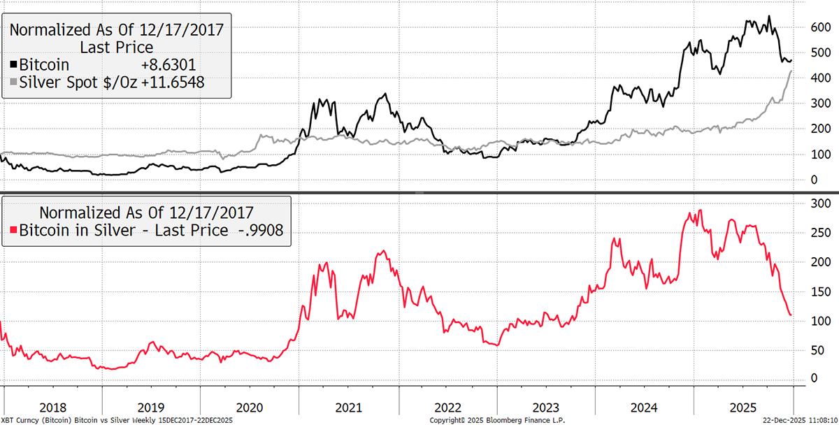 I repeat this chart from last week showing Bitcoin and silver. Who would have thought that silver would return the same over 8 years?