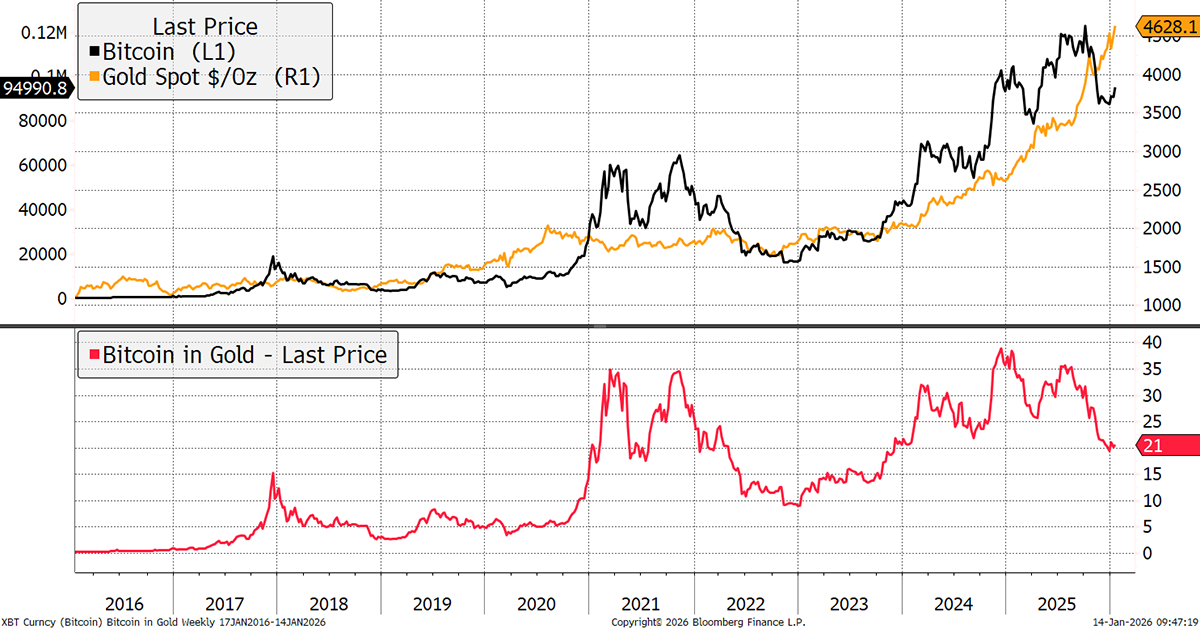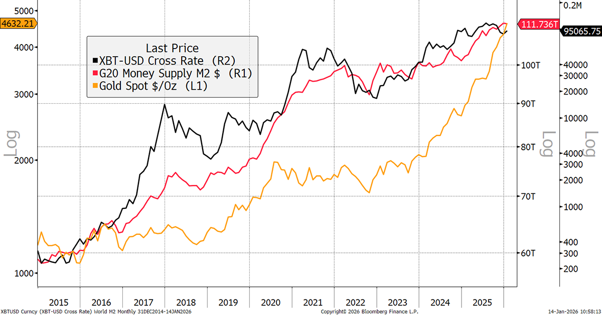 Both Bitcoin and Gold are said to be expressions of the money supply, a natural hedge against monetary inflation. Yet against the G20 M2 money supply, it’s an imperfect relationship. The trouble is that Bitcoin is risk-ON, and Gold risk-OFF.
