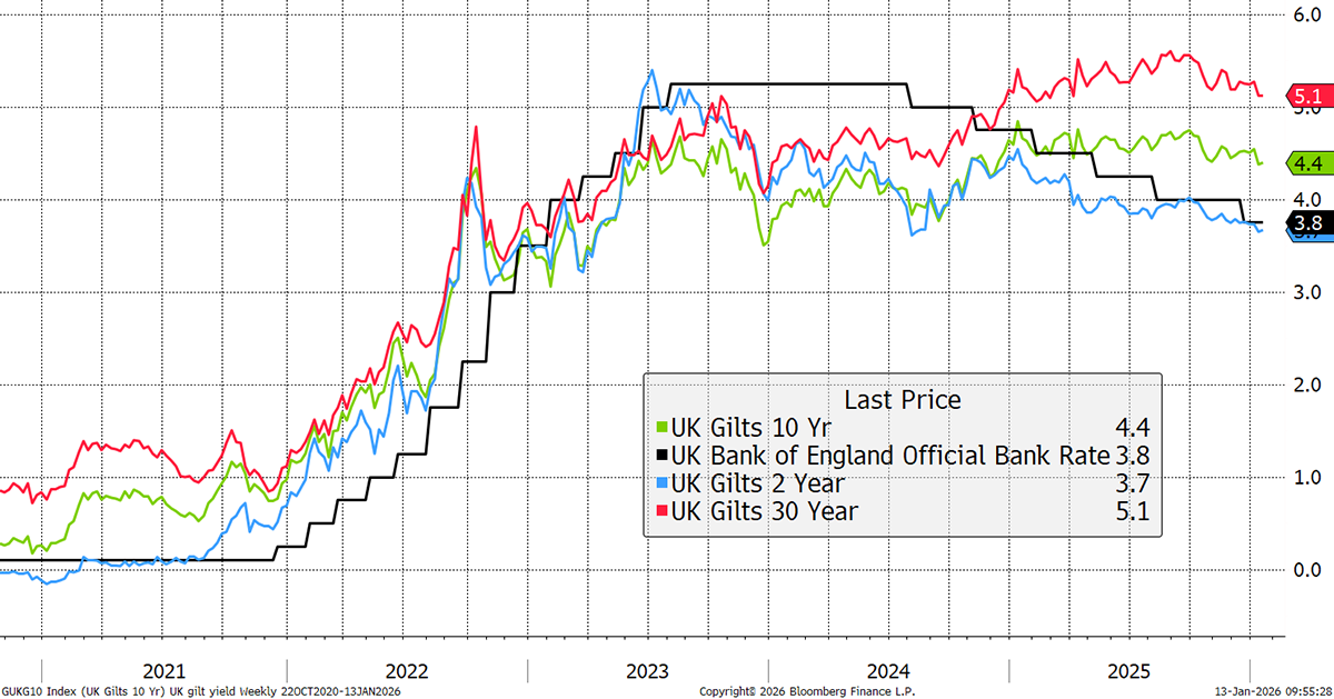 The concerns over the UK national debt haven’t gone away, but are no longer in the spotlight. I would suggest that the rise of the FTSE 100 in Q4 has coincided with falling bond yields. Markets like stability.