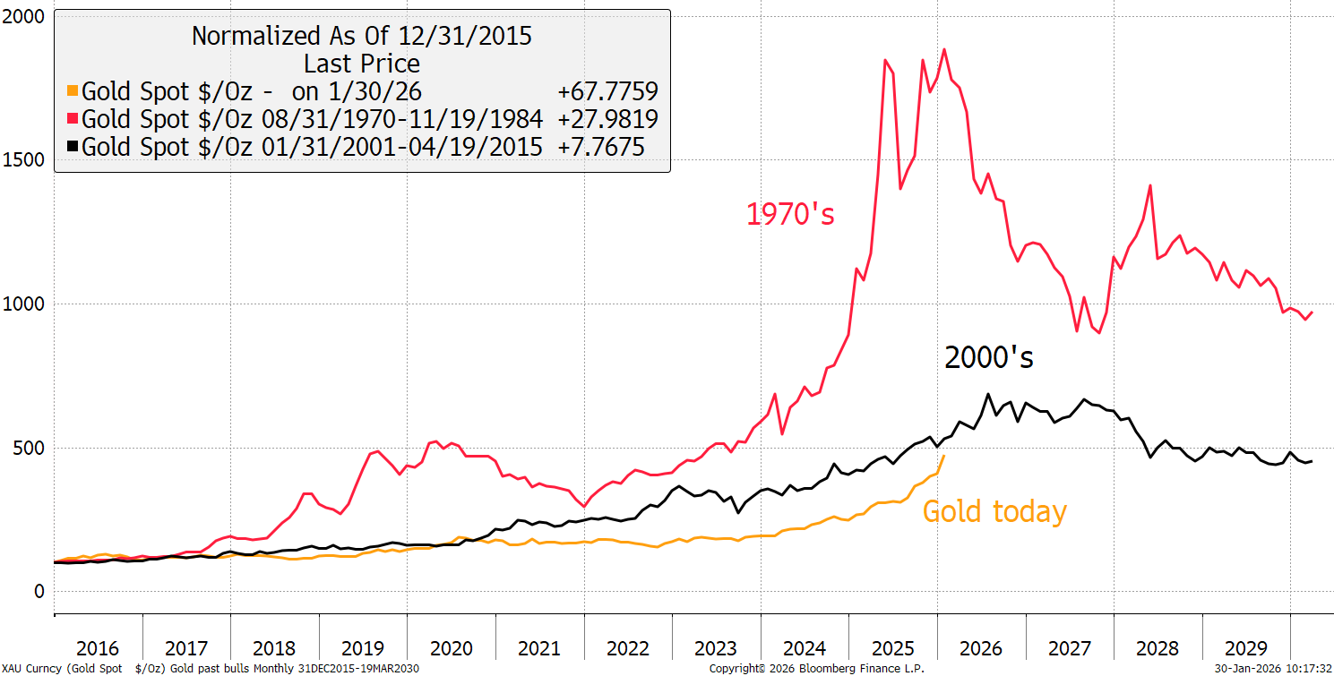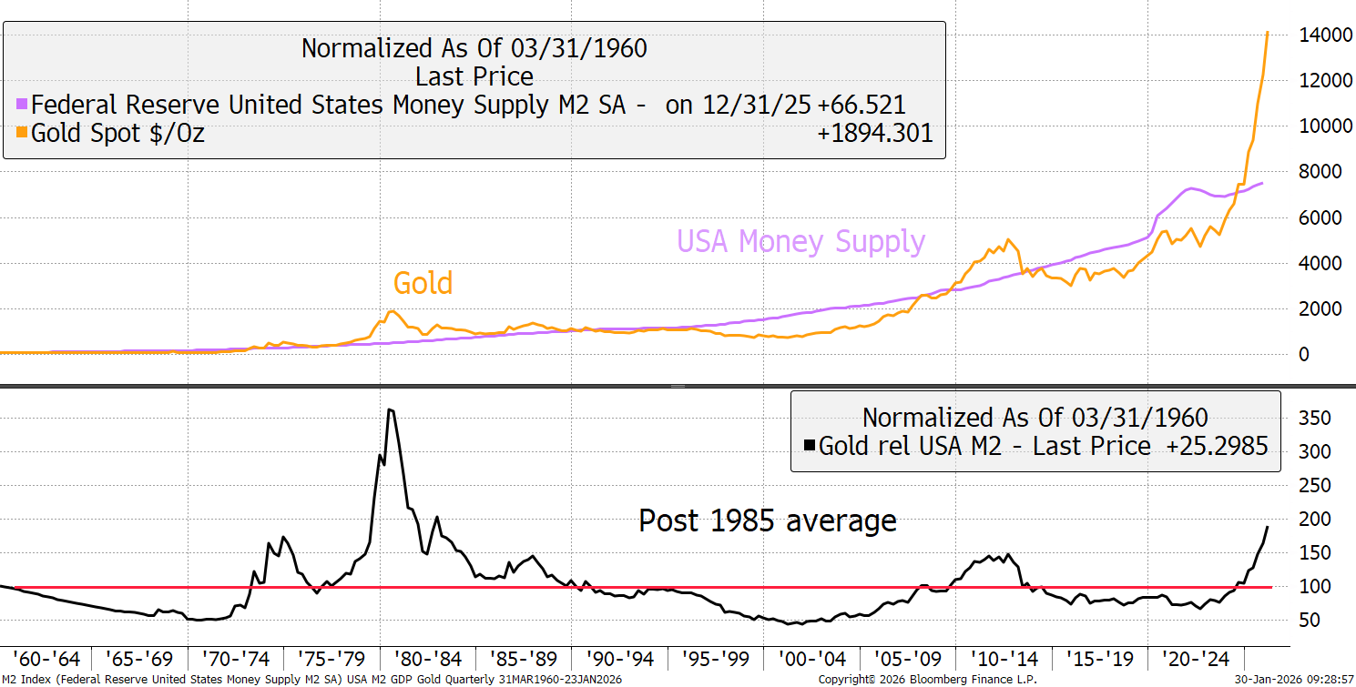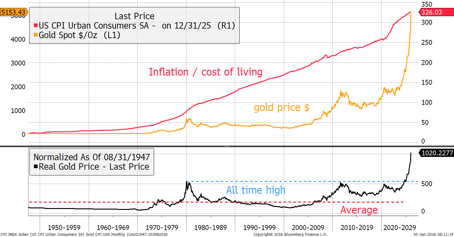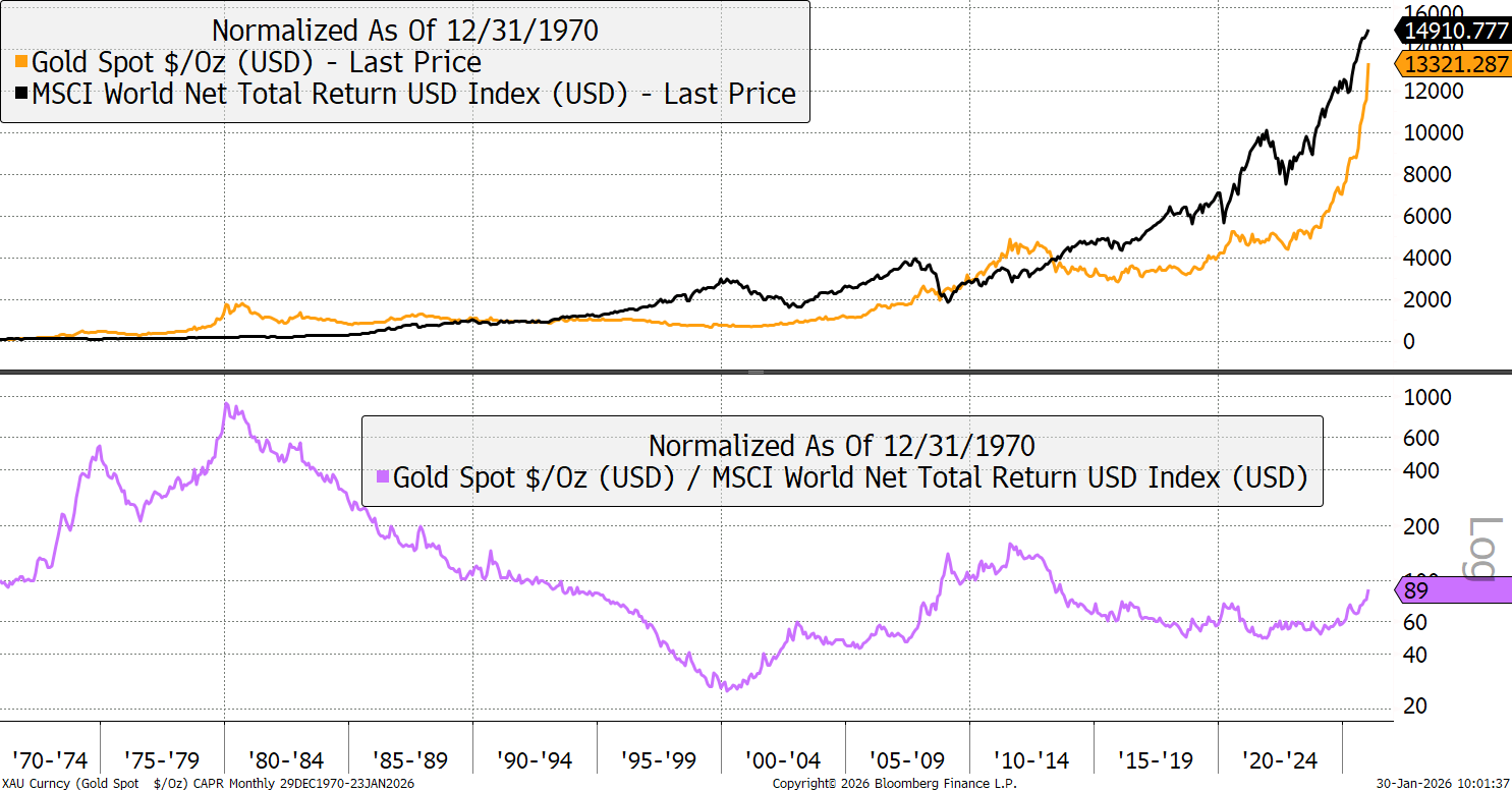 Going back 55 years to 1970, gold and global equities have delivered roughly the same return, including dividends. Gold was ahead of equities in the 1970s, and the 2000s. In 2025, we had a breakout. Gold is in a firm uptrend against the stockmarket.