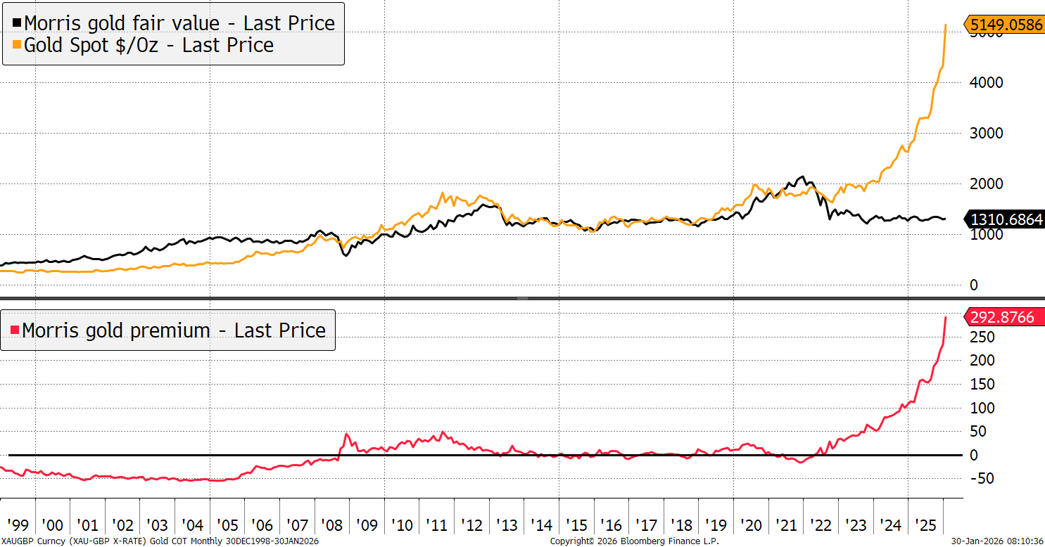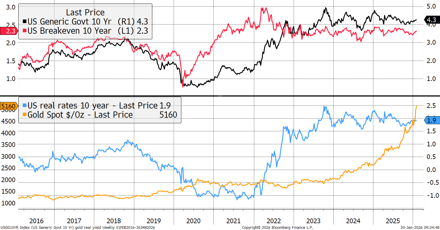 Gold likes falling real yields, which explains the 2019/20 bull run. Curiously, the gold price shook off the hike in real rates, one of the largest moves in history, in 2022. According to the real-rate-gold theory, that should have seen gold crash by 40%, but it didn’t. It fell peak-to-trough by just 17% and soon recovered. Since 2023, real rates have been broadly stable.