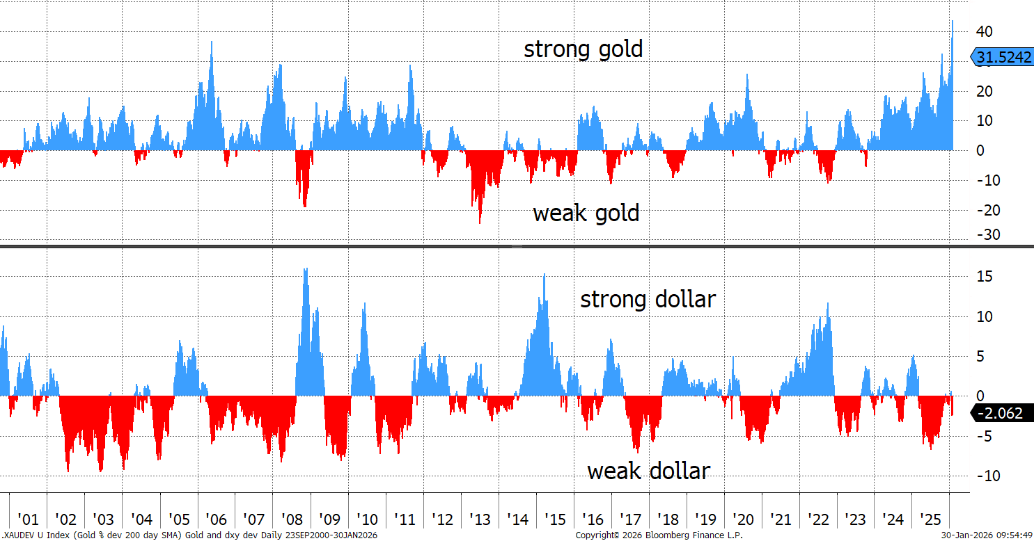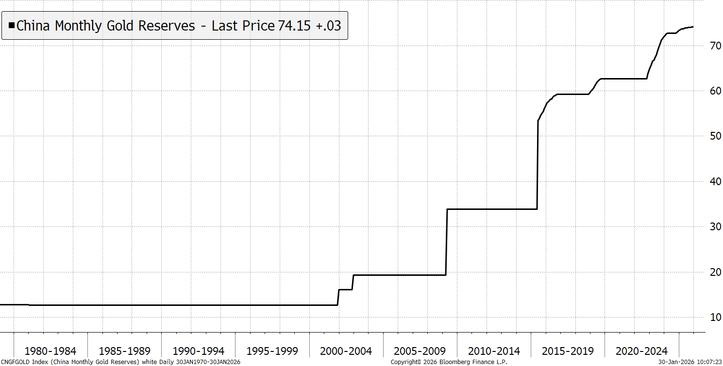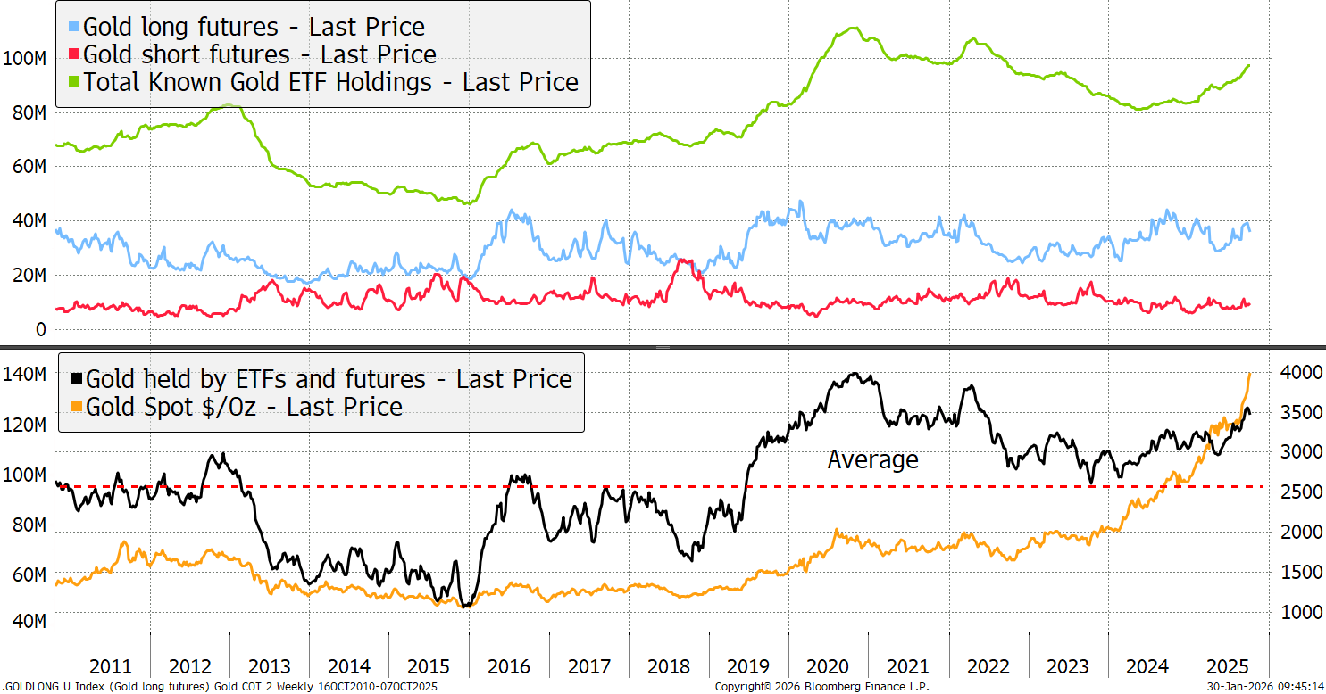 The ETFs (green) gold 105 million ounces, an amount that has not been rising that much, given the scale of the rally. This is a curious thing. The long speculative futures (blue) are high, but not that high either, and the shorts (red) have disappeared. Total Western speculative ounces sit at 110 million, which is below the peak in 2020, when we thought $2,000 was a high gold price. You can’t attribute the gold move above $5,000 to western speculators, bigger forces are at play.