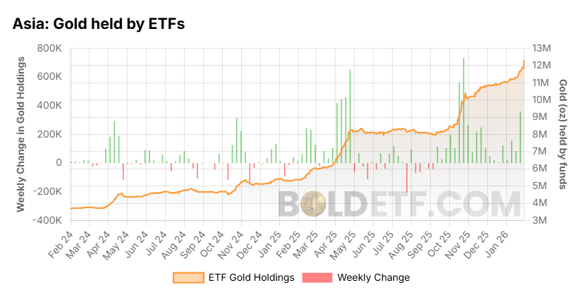 Global gold ETF demand is understated by 5 million ounces on Bloomberg. Fortunately, ByteTree has come to the rescue and can demonstrate this. That data set shown three charts up misses out on somewhere very important: Asia. Over the past two years, retail investors in India, Hong Kong, and China have added 12 million ounces of gold to their stash. Note how they stepped up last October, after the price correction. It already looks like they are doing just that.
