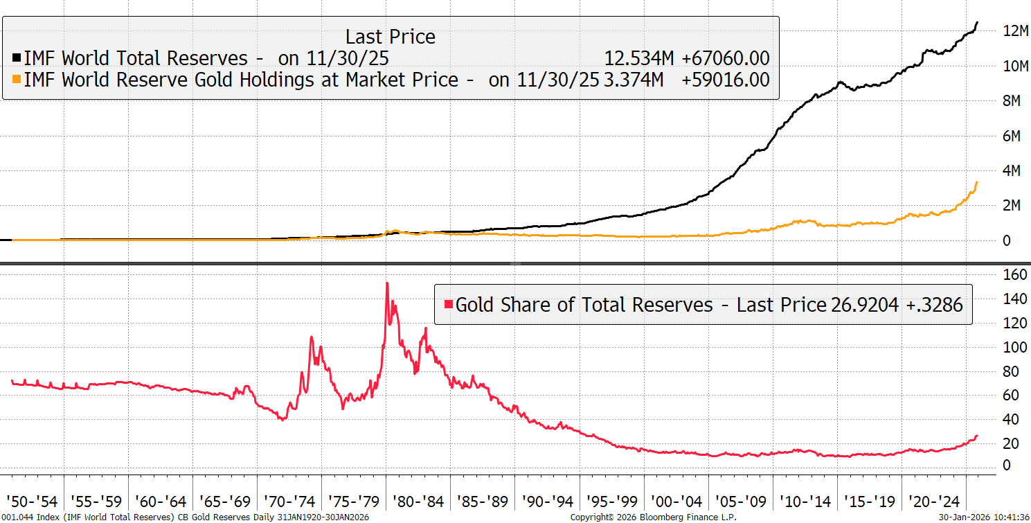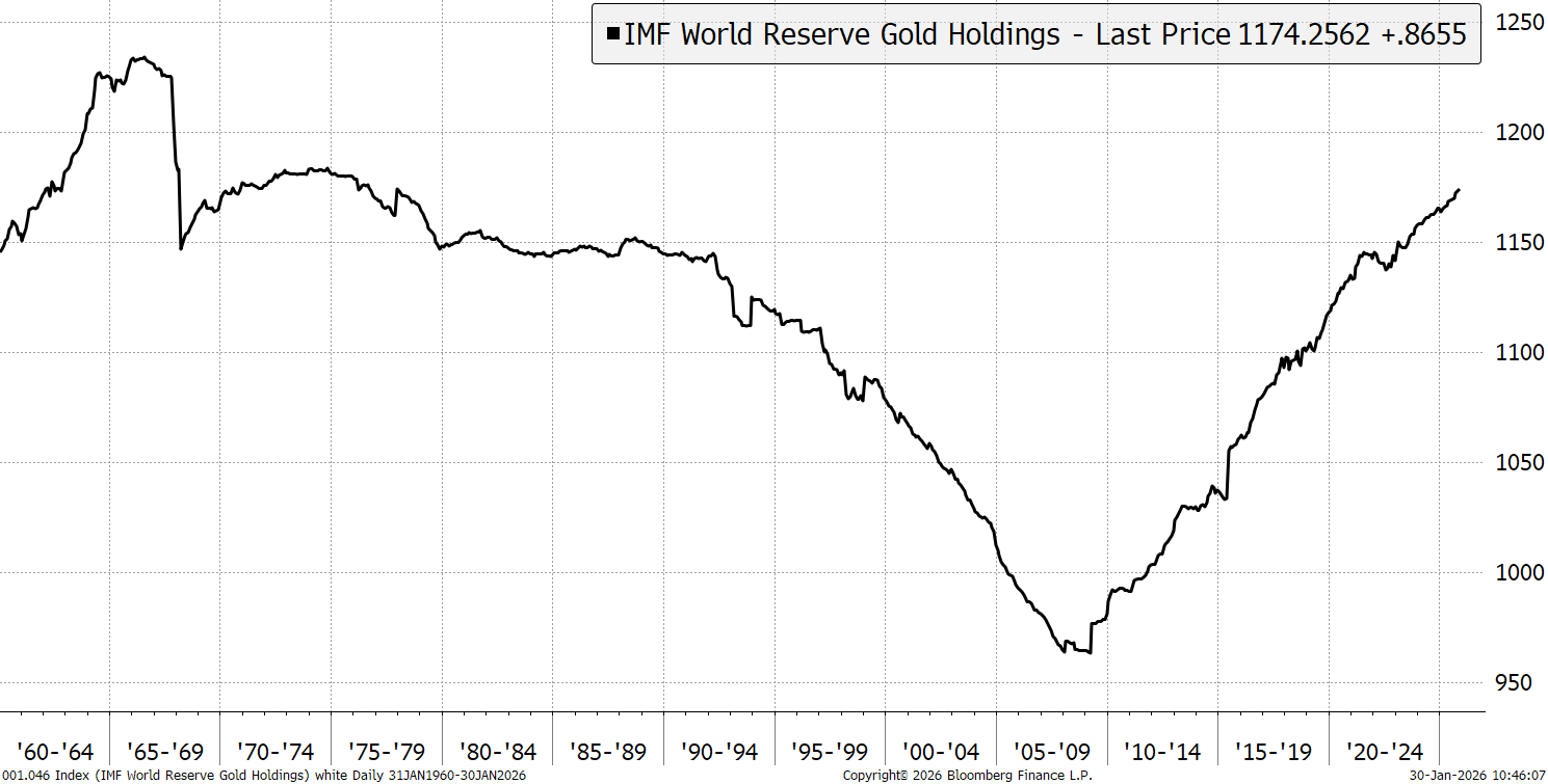 Part of this increase has come from a higher gold price, but it has also been accompanied by purchases. The central banks were selling gold into 2009 and then started to accumulate. This is overwhelmingly led by the non-OECD countries, which have grown gold reserves rapidly in recent decades. Gold reserves, by weight, are approaching an all-time high. Let’s not forget that many central banks underreport their true holdings.