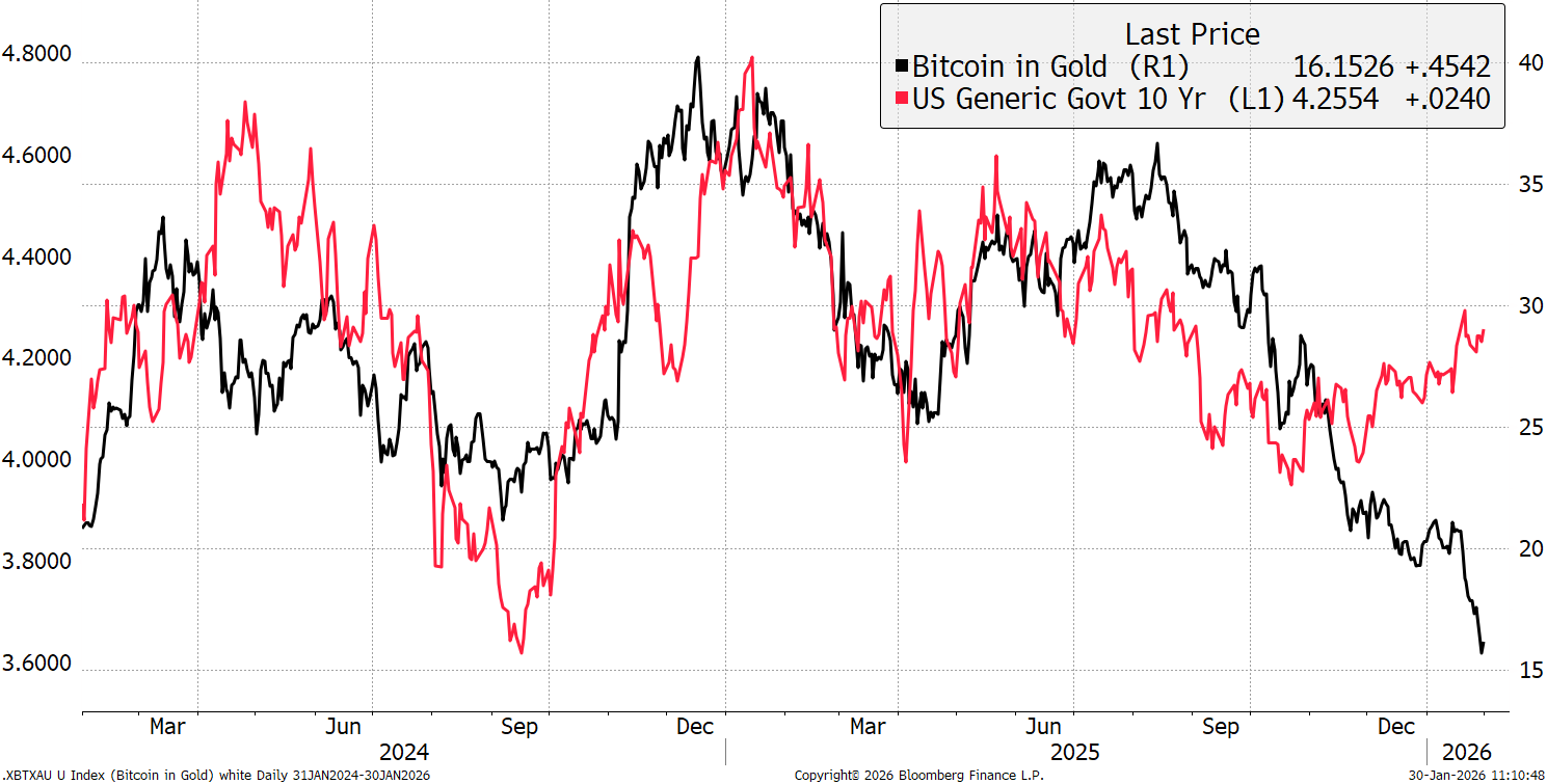 When bond yields spike higher, probably accompanied by rising inflation expectations. I would reasonably expect Bitcoin to once again start to outperform gold.