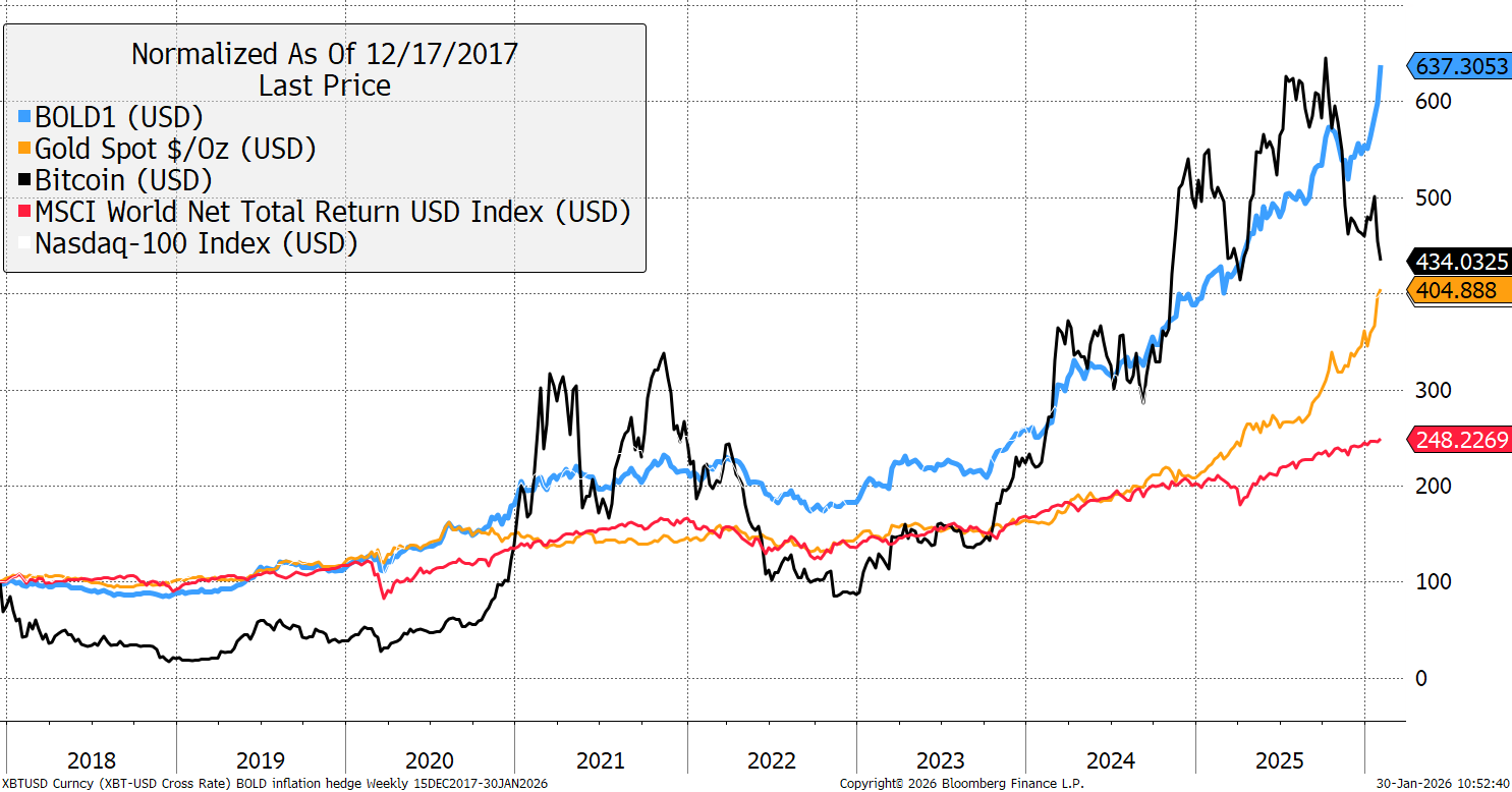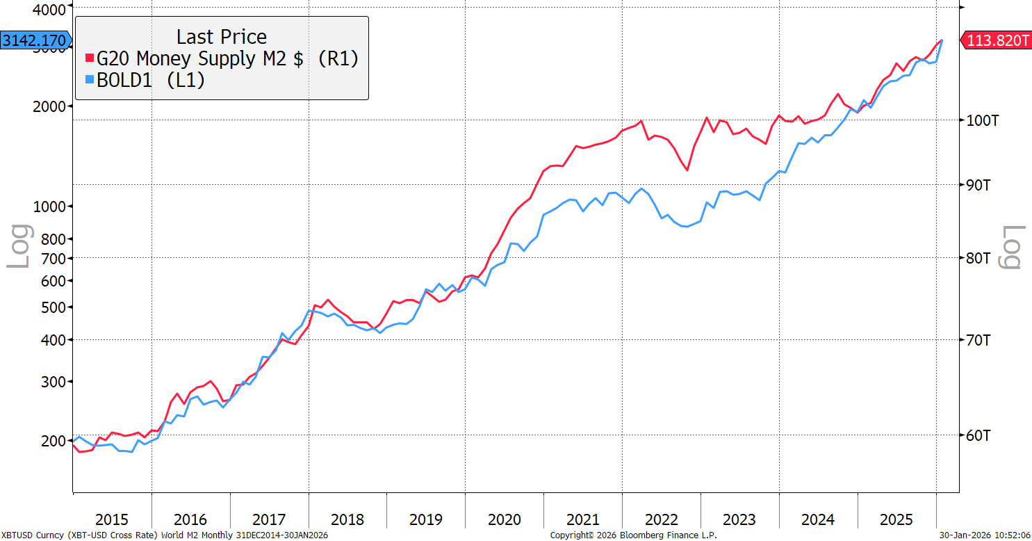 The best bit is that Bitcoin and gold, risk-weighted (roughly one third, two thirds respectively), have this remarkably close correlation with the global money supply. That has nearly doubled over the past decade, while BOLD has returned multiples of that. A gold to BOLD switch makes good sense up here.