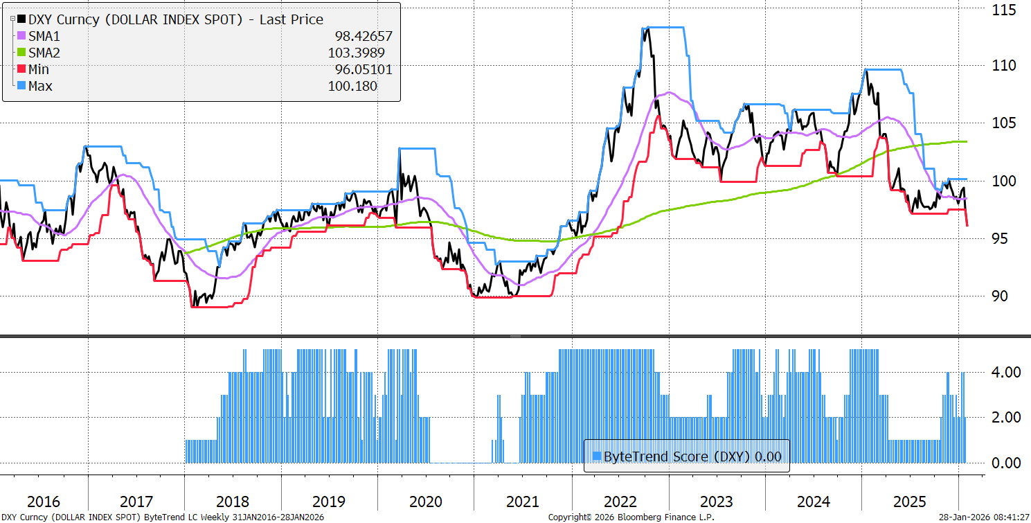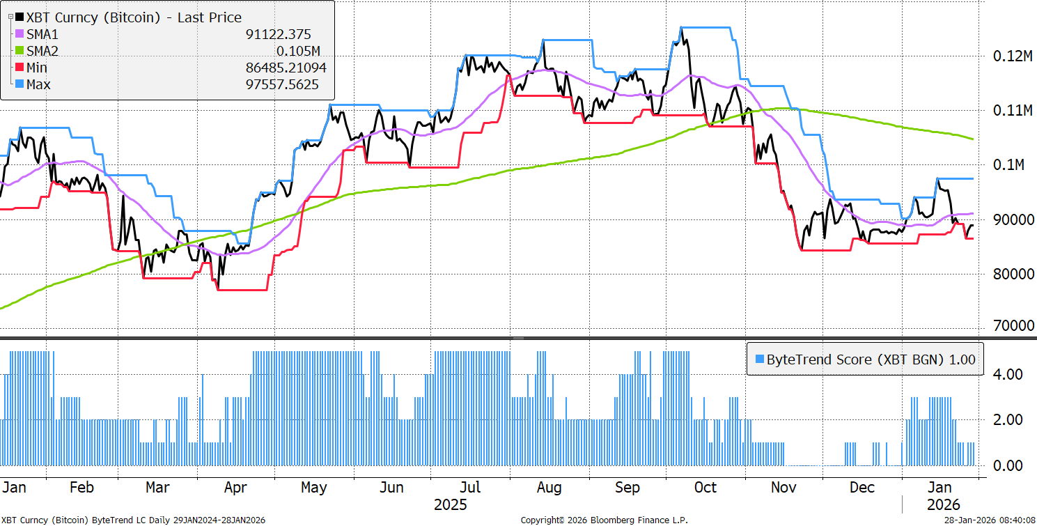 Bitcoin鈥檚 ByteTrend Score stays at 1. There is still no new low, and with a slumping dollar, perhaps we should expect more.