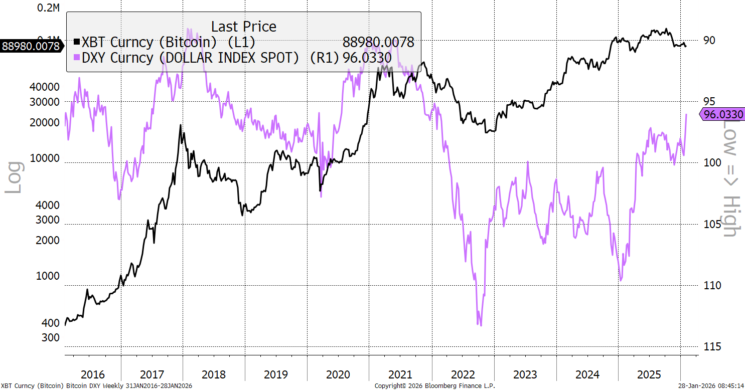 Historically, a weak dollar has been a Bitcoin bonus. It is shown (in purple, inverted) with close links in 2017/18/20/22, but less so since, in terms of correlation. Yet it is easy to forget that dollar weakness has been a theme since October 2022.