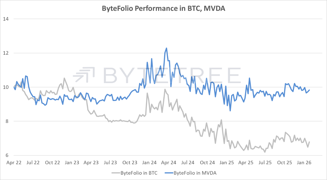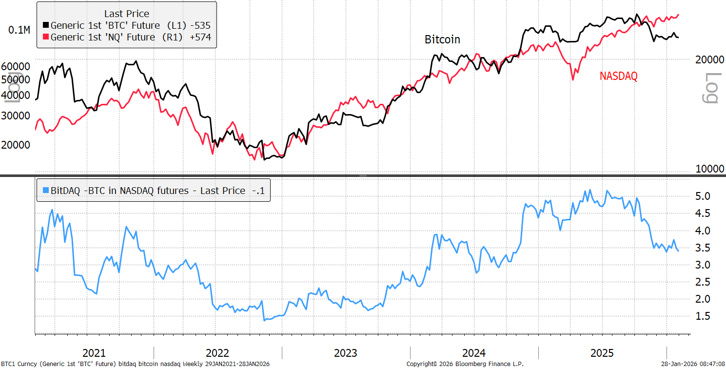 The BitDAQ, or Bitcoin in Nasdaq, remains soft, but an optimist might point out that 3.5 (blue) is over twice the 2022 low.