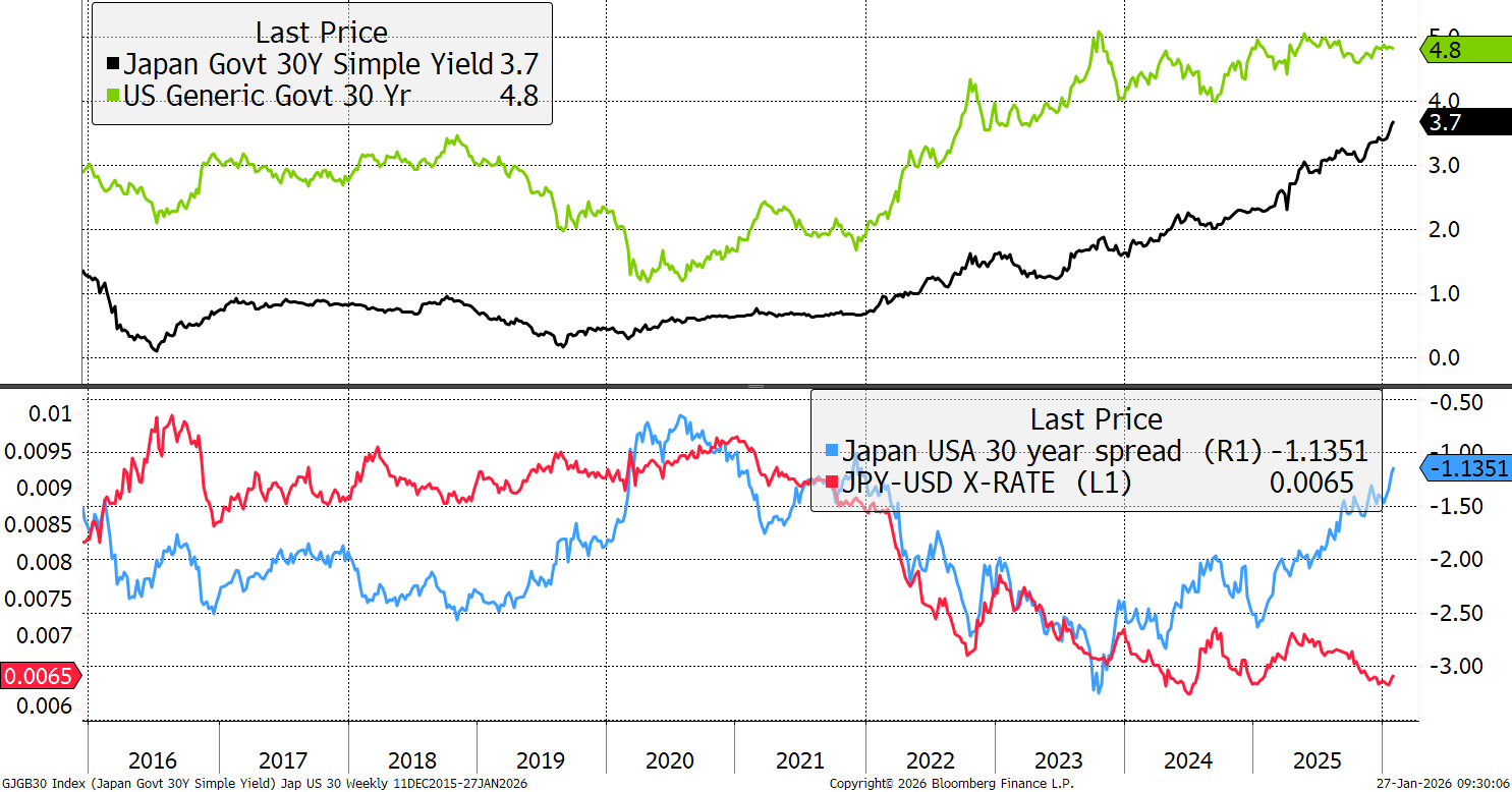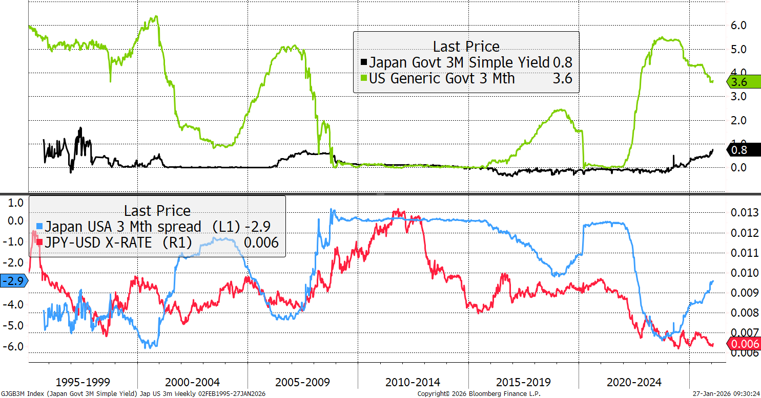 There has been much concern as Japanese long government bond (JGB) yields (black) have risen sharply, from near zero to 3.7%, thus normalising against US Treasuries (green). The spread (blue) has been rising sharply, and that ought to drive the yen back towards fair value. I believe that a rally in the yen could come as a shock to financial markets, as it has in the past. A strong yen repatriates capital from abroad, thus sucking the life out of markets.