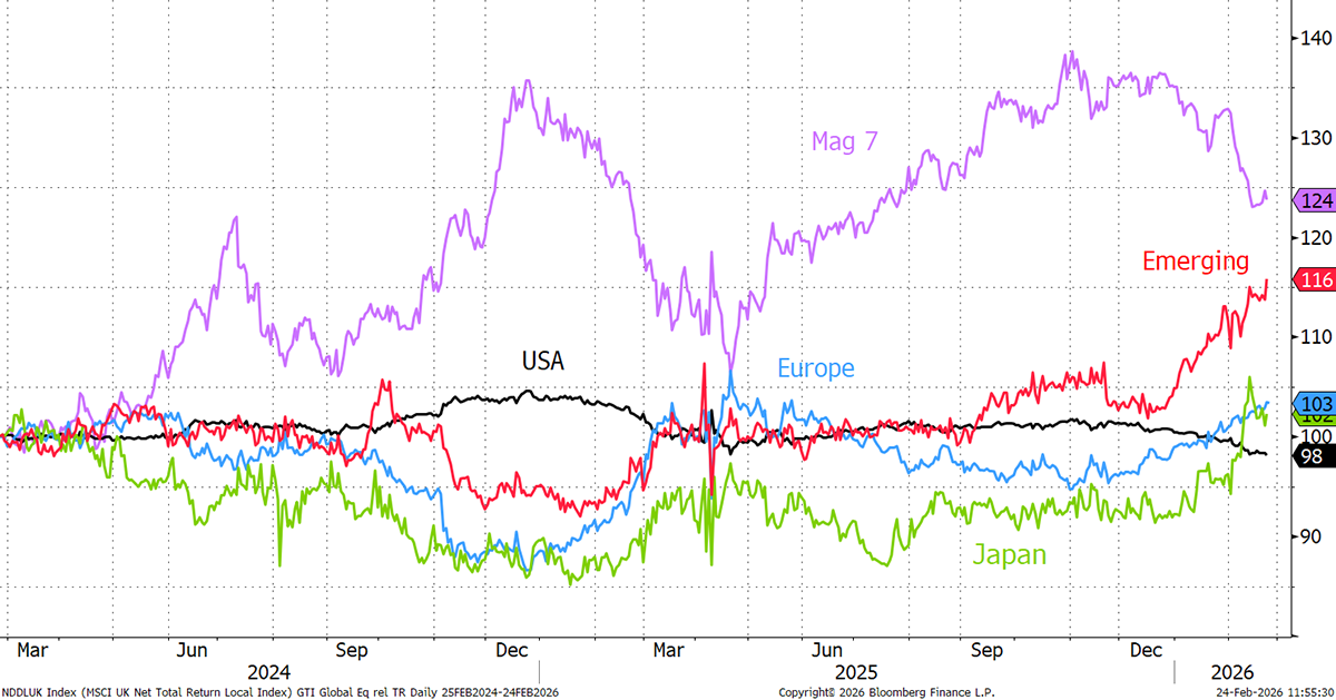There have been some major developments since the tech peak in October. Since early 2025, the divergence between the US market and the rest of the world has been widening. The Magnificent 7 - largest US tech stocks - did well until October but have turned down sharply since. In the meantime, emerging markets have been strong, followed by Europe and Japan. Over the past two years, the USA has been sliding versus the world.