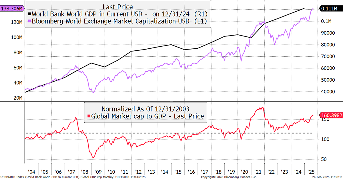 It’s all well and good to be in the right place and watch the US tech collapse (semiconductors excluded) from the sidelines, but as the saying goes, if the US sneezes, the rest of the world catches a cold. In the bigger picture, we should be concerned about global equity valuations. The value of global equities is now 160% of GDP, which is above the 2007 level, ahead of the credit crisis, and catching up with the bubble of 2021. Valuations are uncomfortable up here as stocks are ahead of the economy.