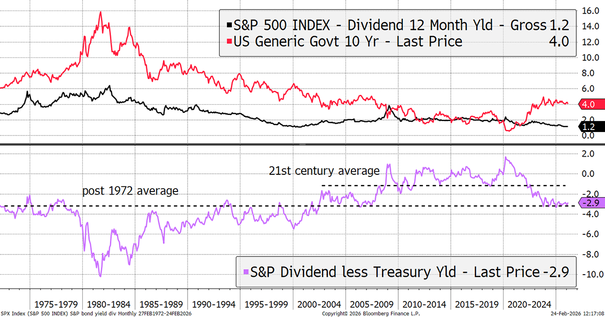 Naturally, we can blame US tech, most of which is now in retreat. Following the devastating bond bear market of 2021/22, bonds now yield 4% against the S&P 500 of 1.2%. That low equity yield was last seen in 1999, when equities turned down sharply. Now that bonds have started to rally, the concern is that a 2.9% “yield gap”, rarely seen in the 21st century, will be seen as attractive by large investment institutions seeking safety. If they buy bonds, they’ll have to sell equities.