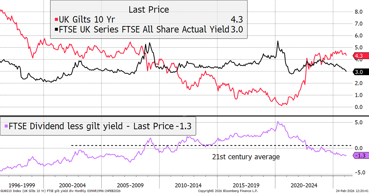 The UK is in a slightly better position than the US, but not by as much as many would think. The FTSE yield is 3% compared to 2% in 1999, and the 10-year gilt 4.3%. The yield gap is not as wide here, which is a good thing, as it suggests that equities may have more to give. But make no mistake: the best is behind us.