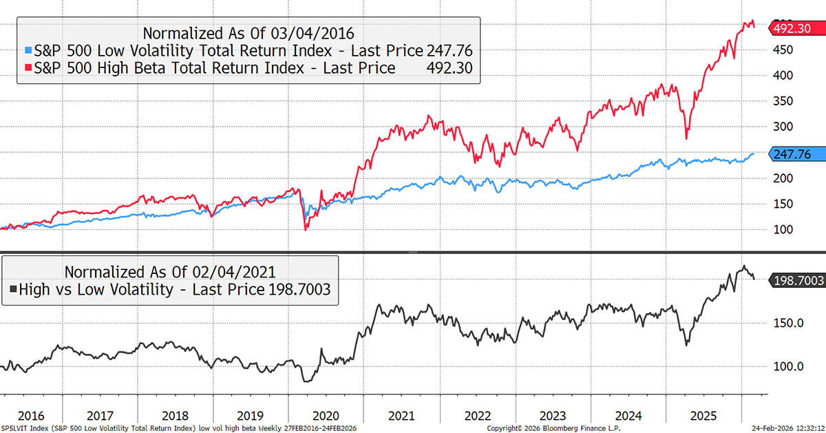 The volatile “high beta” speculative stocks (red) look like they have peaked, while the cautious low-volatility stocks have broken higher after a prolonged pause. This often coincides with strength in the bond market. The recent boom in speculative stocks has been too much, and will end in tears, just as it always does.