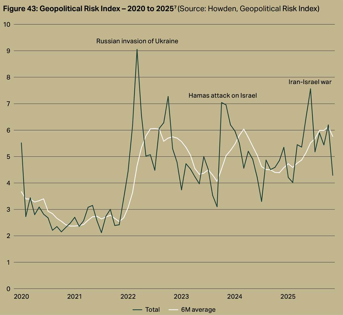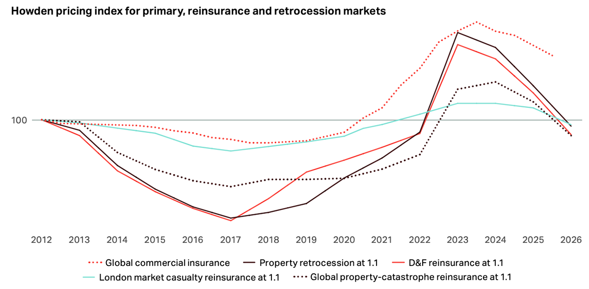 The reinsurance market has enjoyed some of the best market conditions for over 20 years. Catastrophe reinsurance pricing was broadly flat in 2024, which followed an uptick of 25% in 2022 and 37% in 2023. After two years of strong returns, catastrophe pricing reduced by 5-15% in 2025. Pricing levels are nonetheless still at levels not seen since the mid-1990s.