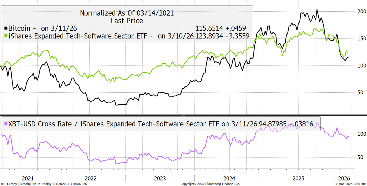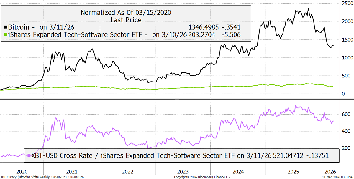 Like Bitcoin, software is virtual, and wars remind us that the digital side is more insulated from disruption than the real world. In that sense, recent events have been supportive. Bitcoin has traded in line with the software sector over the past five years, with the same performance, meaning $100 invested in Bitcoin or software stocks has had the same result. I find it hard to believe that Bitcoin drives the software industry; it is presumably more likely that it is the other way around.