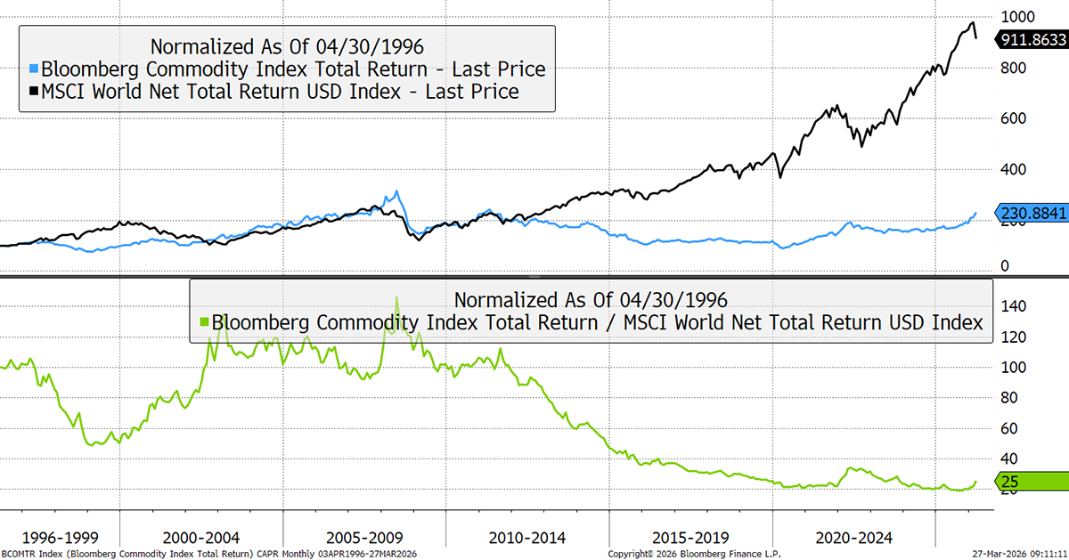 Over 30 years, stocks have beaten commodities fourfold. Yet there have been times when they have led the stockmarket, such as in the 2002-2011 era. What we are seeing today is an upturn in commodity prices and a downturn in equities.