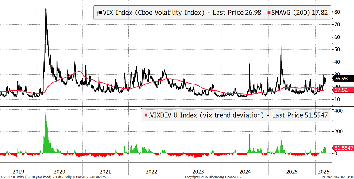 The VIX Index, a measure of fear driven by the cost of options, remains elevated. For confidence to reinvest, I need to see indicators such as this back on a stable footing.