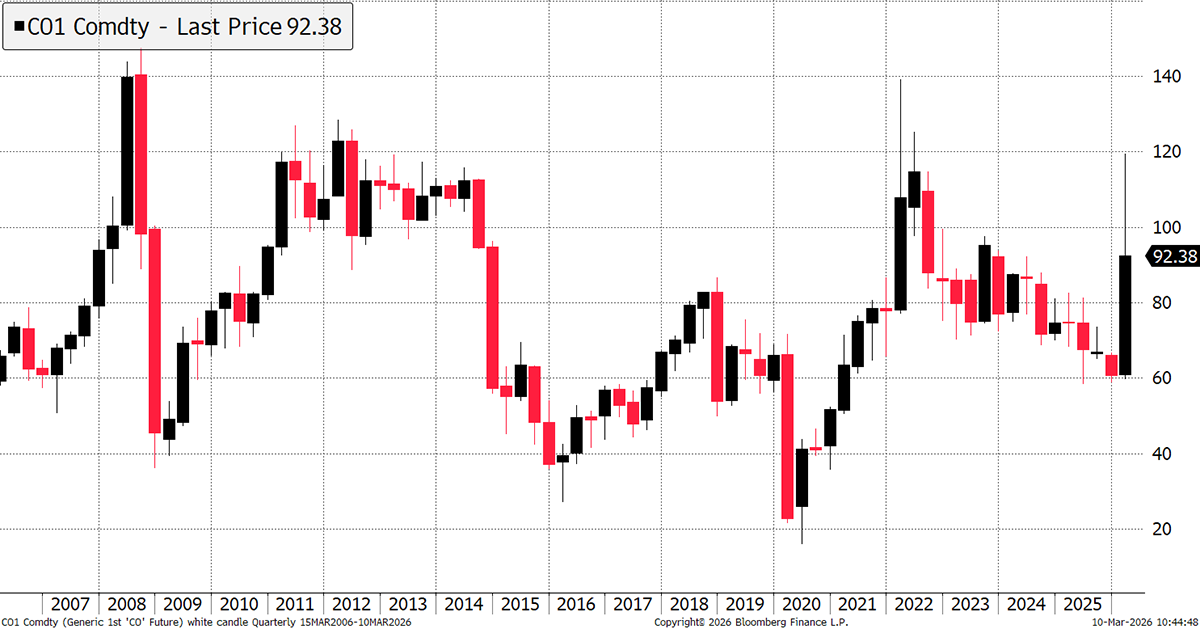 A new chart for the textbooks, where the price of oil rises and falls by 30% in a single day. To put it into a historical context, I show it using quarterly data, but yesterday’s daily range was between $83.66 and $119.50.