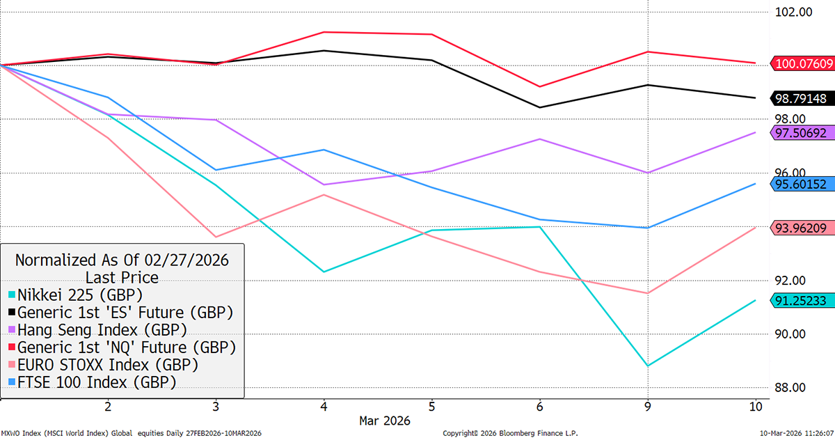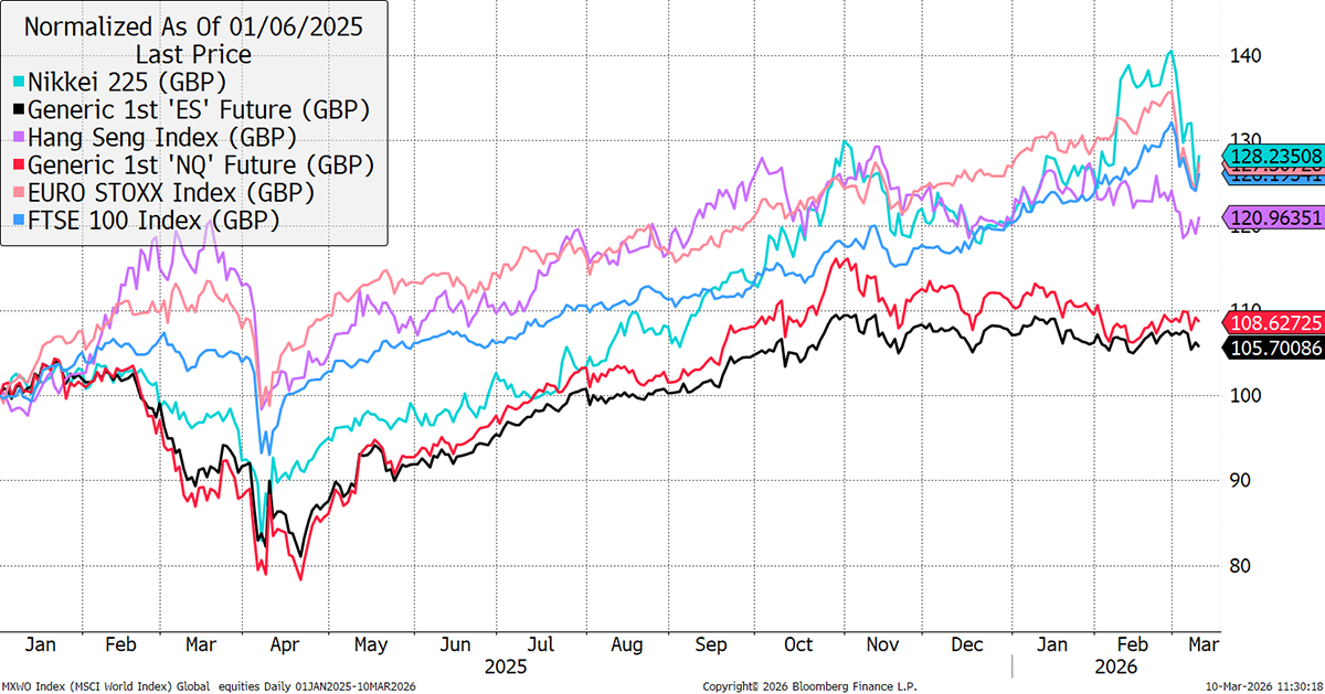 Yet the World Index fell by 3.7% peak to trough since last Friday, ahead of the strikes. The US market barely felt it, while Europe and Japan took the brunt. For reference, “ES” (black) is the S&P 500 future, and “NQ” (red) is the Nasdaq.