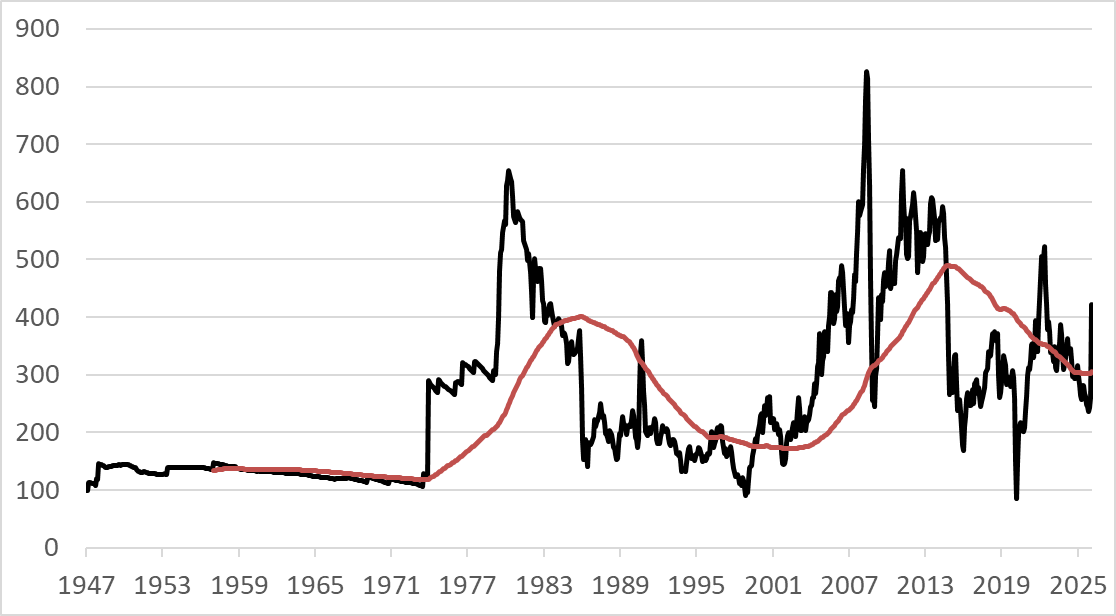 The Real Oil Price as a Percentage of the 10-year Moving Average