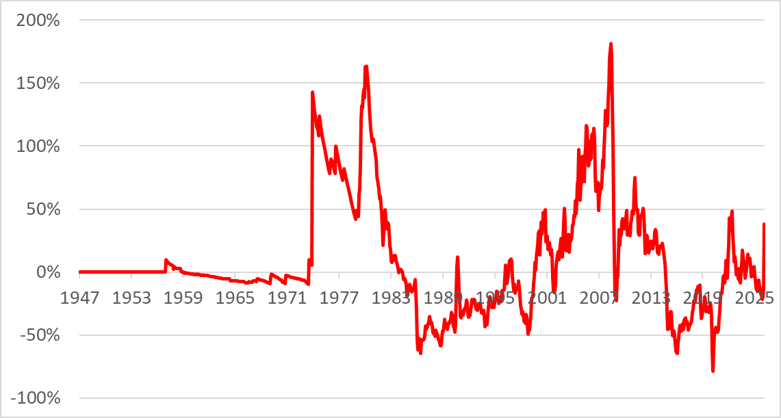 The impact on the stockmarket was excruciating. The market had peaked, in real terms, in November 1968. As inflation cooled coming into 1972, the market rallied. But as mentioned, the US came off the gold standard in 1971, so inflation was already rising. The oil embargo poured fuel onto the fire, and inflation rose to 12% by late 1974. The S&P 500, in real terms, fell by 59% from the 1968 peak into 1974, and didn’t make a final low until 1982, which was 64% lower than the peak 13 years earlier. Dividends would have offset some of this, but still, it was a terrible time for investors. Oh, and equities beat bonds.