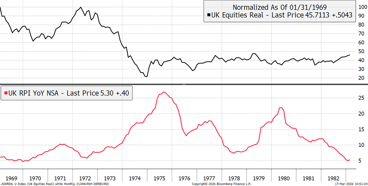 If you think that was bad, let’s take a look at the UK. The FTSE All-Share peaked in 1969, only to retest that high in 1972. Inflation rose to 27% by 1975, and the UK stockmarket fell by 80% in real terms. Now that’s a bear market for the history books.