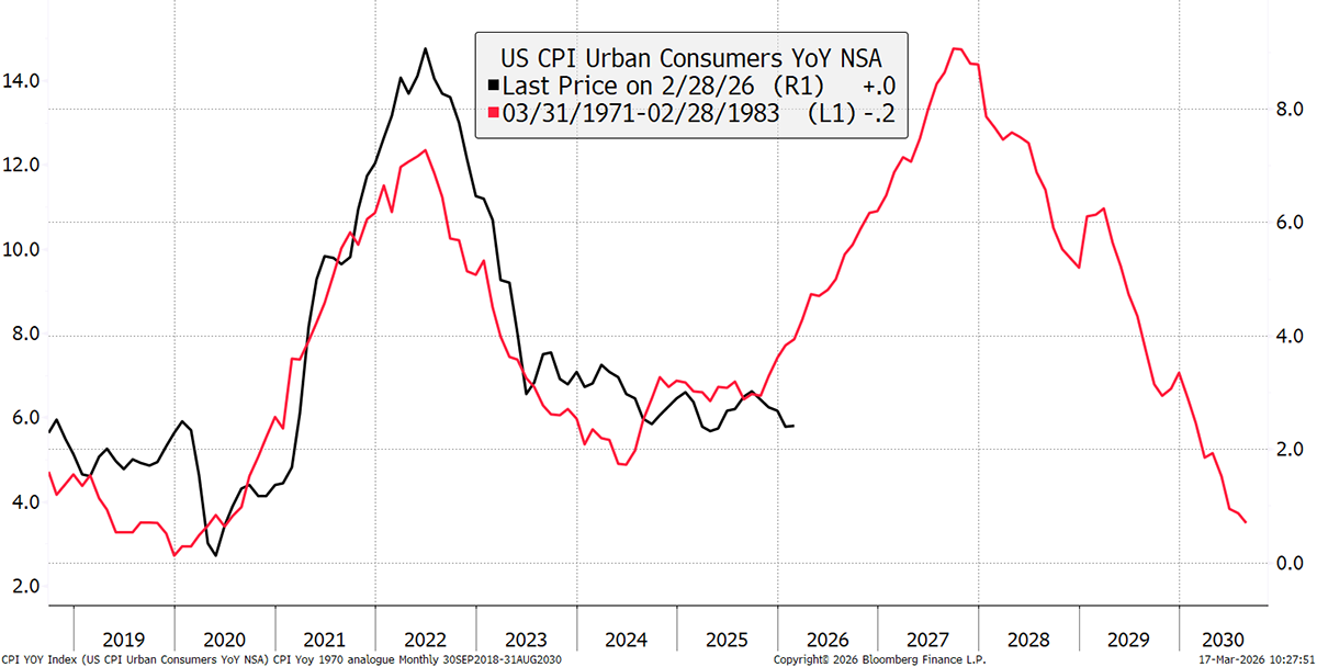 This inflation chart has been doing the rounds, showing US CPI in the 1970s, with the past six years overlaid. We shouldn’t take past analogies too seriously, but our worst nightmare has happened before and could happen again.