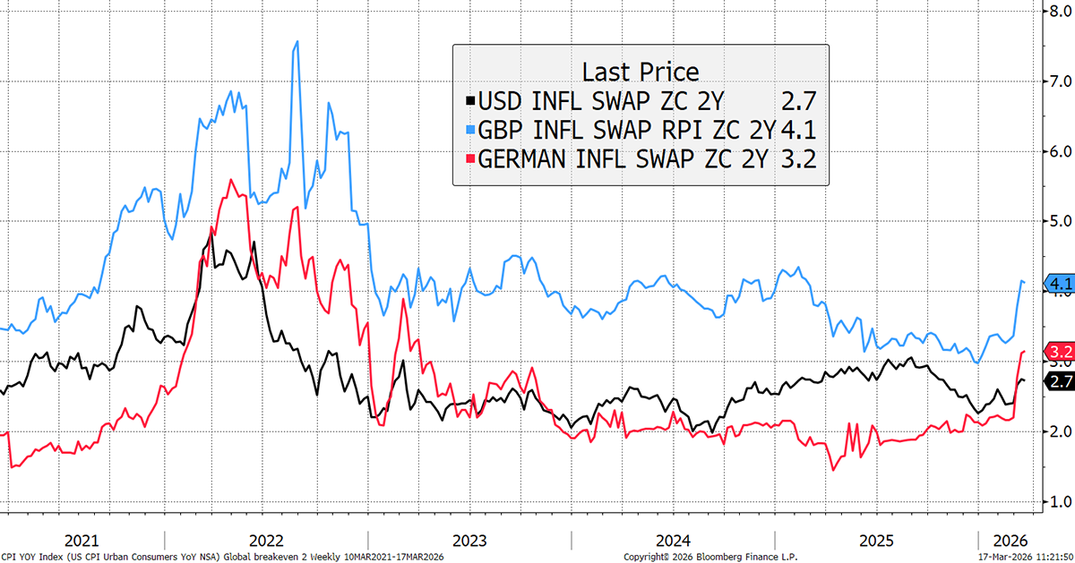 It’s still early days, but two-year expected inflation is rising. This is not yet significant, but if the oil price keeps rising, it soon will be.