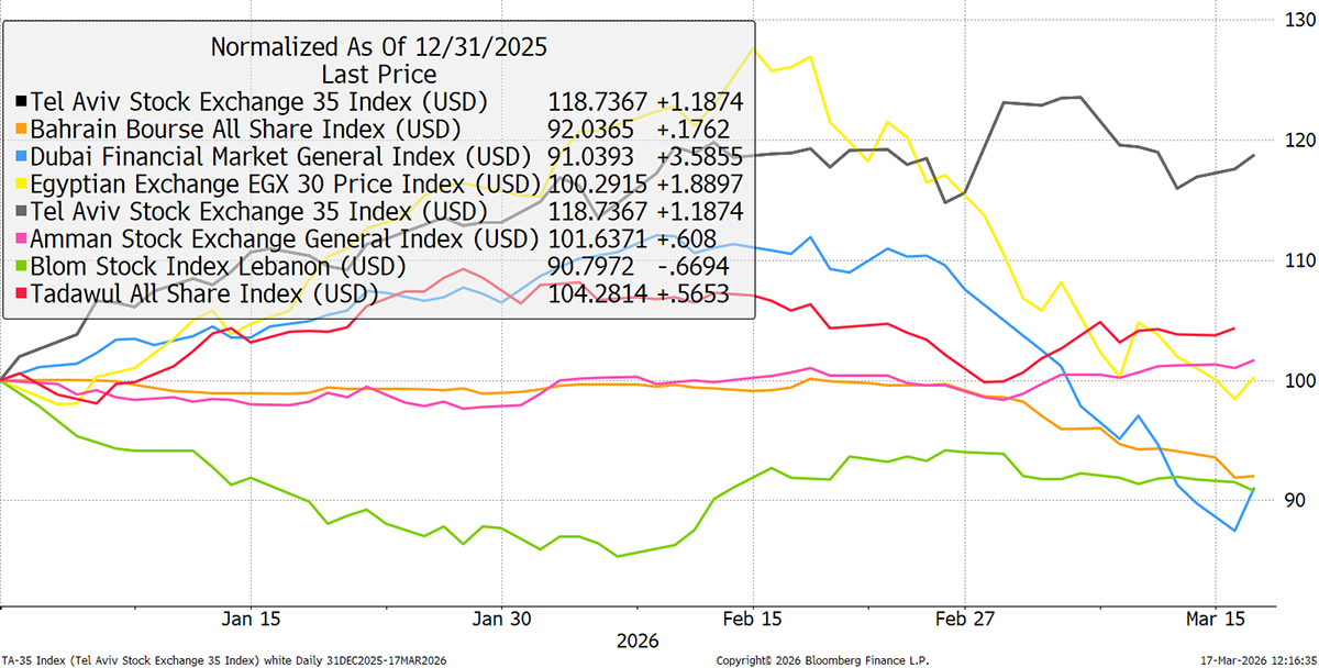 The Israeli market is full of defence, energy, and tech companies. It’s an impressive list, but sadly, the only Israel ETF was shot down by BlackRock in 2021. Egypt has fallen from a currency devaluation that started in mid-February. Dubai has fallen, but not by as much as you might think. I would think that the negatives of the war are somewhat offset by the higher oil price that benefits the region.