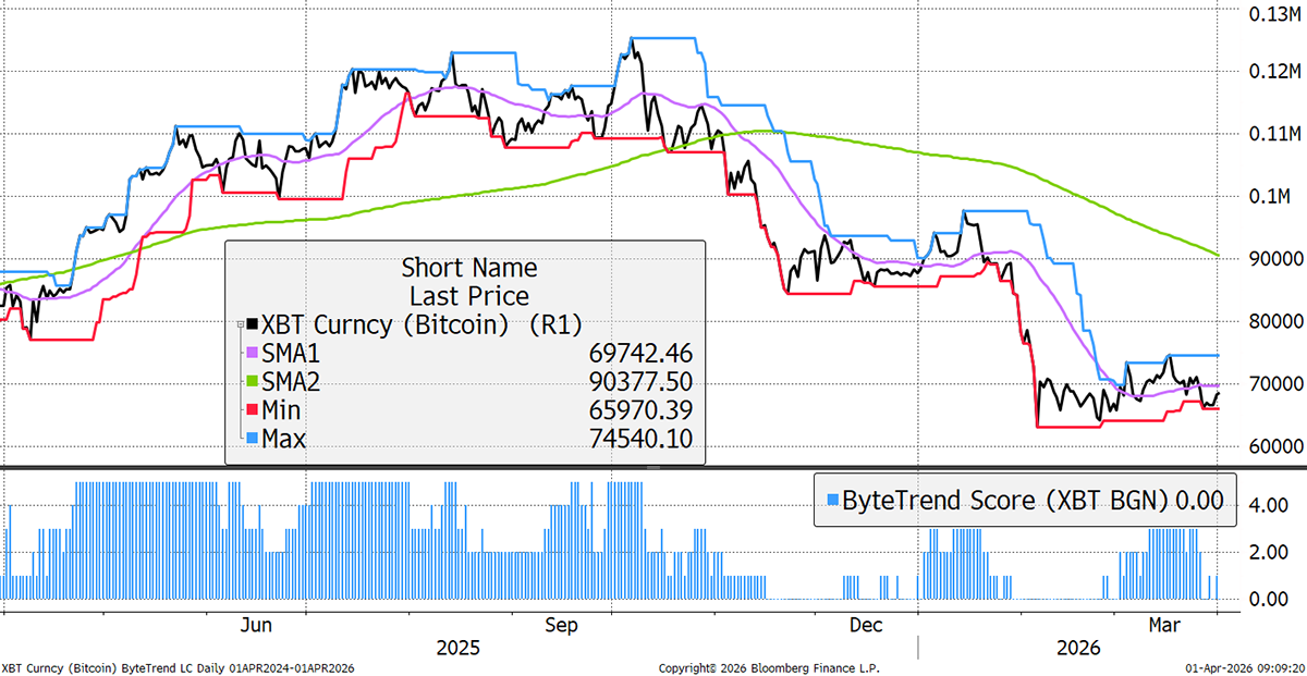 Bitcoin’s ByteTrend Score drops to a 1. The price just made a 20-day low and dropped below its 30-day moving average, which is a setback. On the positive side, there is still no new low, despite the volatile backdrop of the war in Iran.