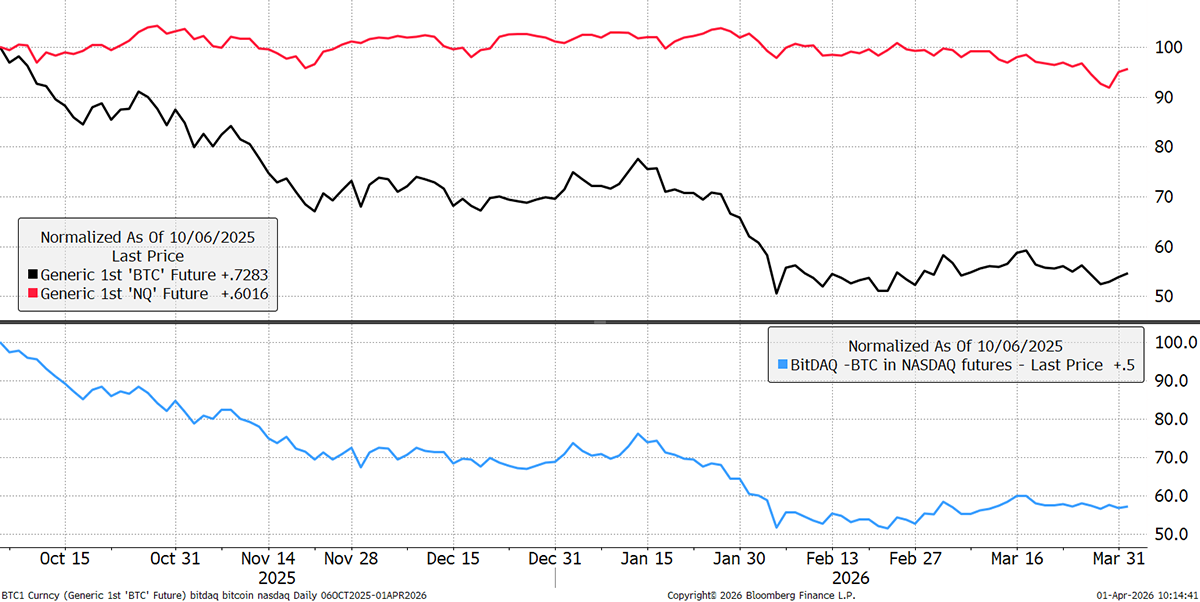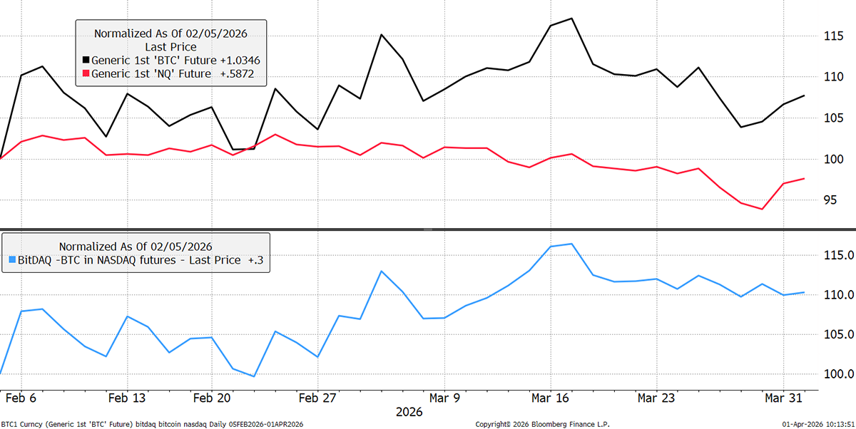 However, since hostilities began at the end of February, Bitcoin has served as a safe haven amid turbulent times. The bull scenario needs to see Bitcoin leadership over tech. Note that the chart begins at the Bitcoin low.