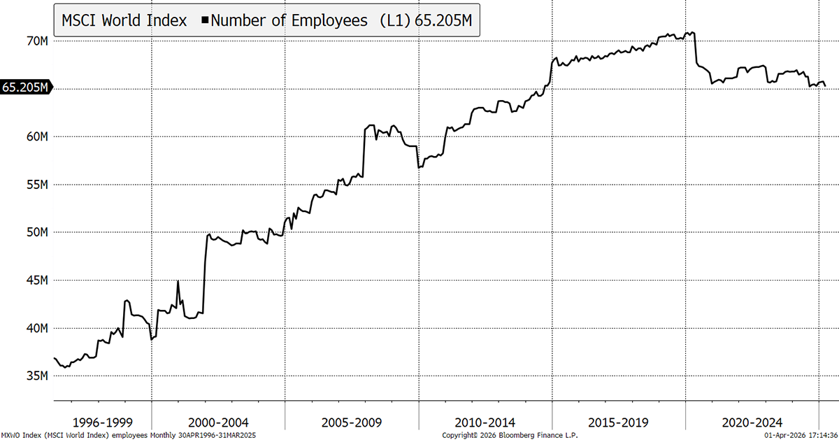 The AI impact on employment cannot be underestimated. This data is somewhat lumpy but shows an interesting trend. According to Bloomberg data, the 1,316 companies that make up the MSCI World Index employed 70 million people in 2019, which has now dropped to 65 million. Meanwhile, the value of the World Index is 85% higher than it was back then, which demonstrates how rising stockmarkets and corporate profits don’t create jobs like they used to.