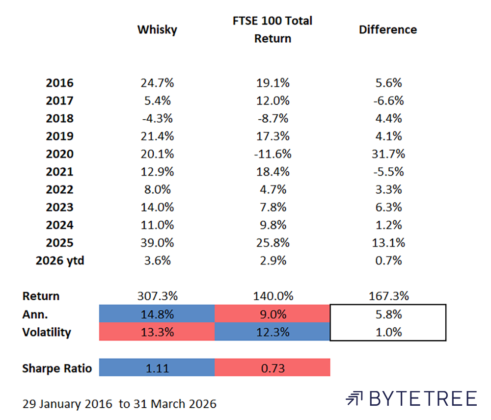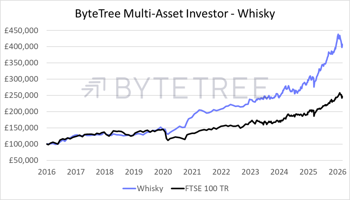 After a strong 2025, Whisky is marginally ahead of the FTSE 100 this year. It was much higher in January, before the crash in precious metals. Long-term performance remains strong.