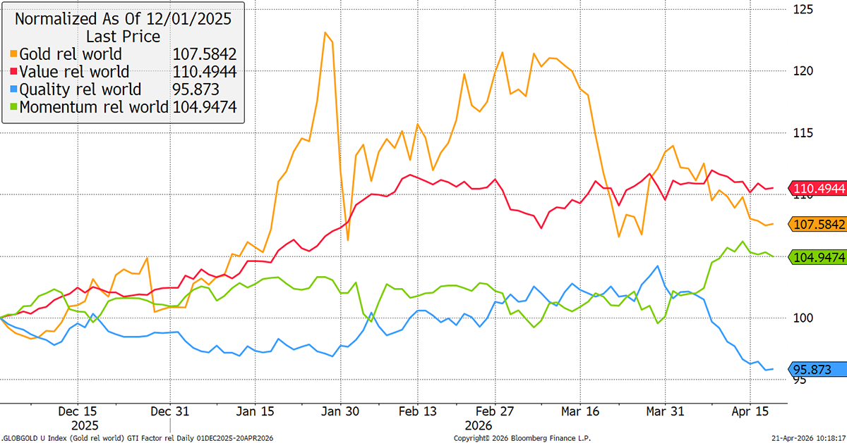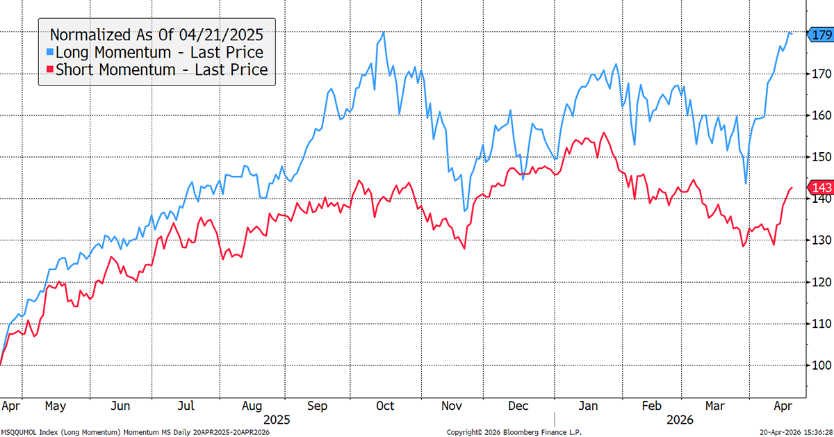 Focusing on the momentum effect, the leaders (past year’s best performers in blue) have shot out of the gates in April, leaving the losers (past year’s worst performers in red) for dust. This signals that financial markets are enjoying the recovery more than the real economy, where the problems lie.