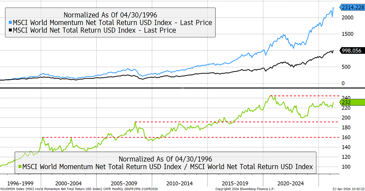 As per my recent flash note, I highlighted some of the key charts to explain this phenomenon. I will show this once again, which compares global equities to the MSCI Global Momentum Index. Despite momentum being a strategy that has been more than twice as strong as the market, it tends to move in bursts. The 1999 peak wasn’t exceeded until 2006, the 2008 peak wasn't exceeded until 2016, and the 2020 peak is still in progress.
