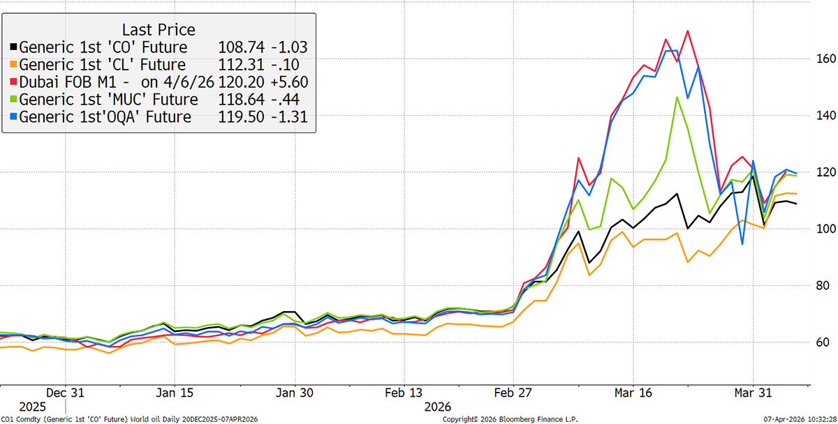 There have been some recent developments in oil. The first is that the different oil benchmarks in the Middle East, such as Dubai and Oman, have again converged with Brent (global price) and WTI (US price). Some of this price disruption is financial, whereby traders have anticipated better functioning markets in the future, but the other part is physical, as the local markets have cooperated and diverted to pipelines and other workarounds. The system is still under pressure, but the market is now functioning more effectively.